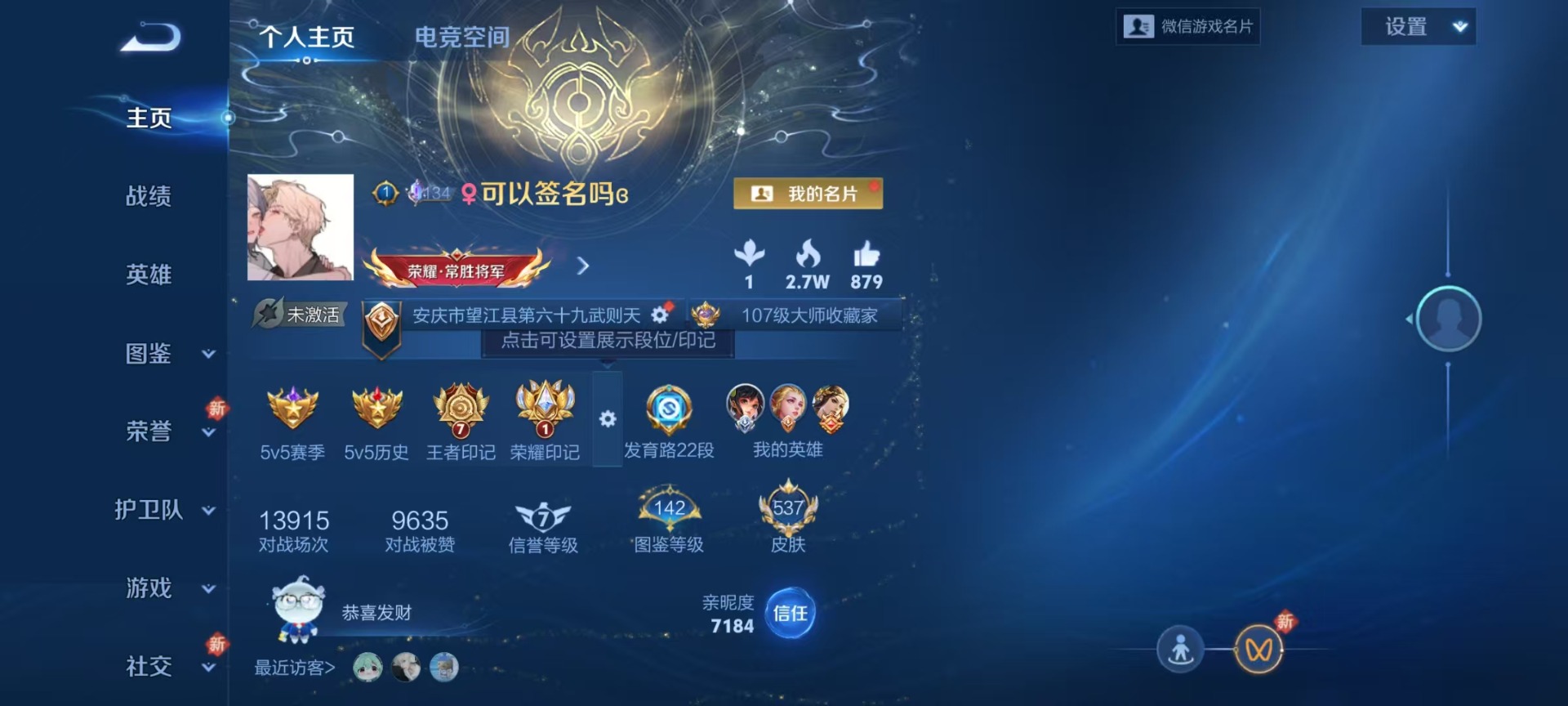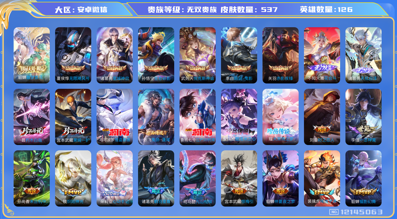 [12145063]无双贵族 6典藏 1珍品无双 2无双 7珍品传说 59传说 126英雄 537皮肤 典藏英雄武则天 女号 安全保护中 可修改实名 优质装备:馥梦繁花,倪克斯神谕(宇宙婆娘),无限飓风号(高达),鸣剑·曳影,全息碎影(猴子典藏),星域神启(倪克斯贼亮),赤影疾锋,花合斗,天机白泽,江户川柯南,怪盗基德,酷洛米之心,大耳狗之梦,朽木白哉,黑崎一护,黄金狮子座,绛天战甲(鸡嘴战神),黄金白羊座,猫影幻舞,久胜战神,炽阳神光,一念神魔,云霓雀翎,末日机甲-孙尚香(绿蚂蚱),地狱火,仲夏夜之梦(大飞蛾),零号·赤焰,海洋之心,胖达荣荣,李逍遥,乞巧织情,时之恋人-刘备(电焊工),超时空战士-狄仁杰,挚爱之约,挚爱花嫁,无双飞将,浮生妄,电玩·雷克斯,鹤羽星尊,妄想实况,惊梅引,澜逐花归海,艾琳觅芳踪,朵莉亚心动手记,诡秘之主,涂山容容 珍品传说:兔狲·蓬尾 传说皮:死亡执政官,九山相柳,云诺千山,祥瑞亨通,幻光神枪 珍宝阁皮:胡桃夹子,女武神,玩趣恶龙 限定皮:愿照·九州拓(澜年限),愿照·众生和(妲己年限),愿照·千秋盛(女娲年限),逐霄战戟,映山客,鸣野蒿,至尊宝,白虎志(电光耗子),凤求凰(白切鸡),太华(伽罗年限),梅西,武陵仙君(小桃花),傲雪梅枪,补天,时之彼端,白鹤梁神女,魔法小厨娘,白晶晶,时雨天司(水龙头),神威(电光马子),飞衡(韩信年限),玄嵩(庄周年限),山海·碧波行(瑶年限),无限倾心-项羽,瑞麟志(木兰年限),至美·乘鲤谣,至美·化雀舞,遇见飞天,高山流水,诗剑行,匿光决锋者,怒海麟威,五谷丰年,青龙志(铠年限),冰锋战神,幽恒(沐浴露),武圣,天狼运算者,梁祝,天狼狩猎者,龙胆,烈魂,岱宗(典韦年限),奔雷神使(牛魔年限),天狼绘梦者,李小龙,逐梦之影,逐梦之光,朱雀志(守约年限),辉光之辰,如梦令-后羿,孙行者,猪悟能,一生所爱,大圣娶亲,引擎之心,天魔缭乱,蜜橘之夏,匿光追影者,女儿国国王,寅虎·瑞焰(虎皮蛋子),寅虎·赤拳(老虎年限),时之祈愿-云中君,时之祈愿-瑶(瑶传限),百木心枪,玉兔公主,启示之音,深海之息(深海大菠萝),唐三藏,枫霜尽,匿光启智者,时之奇旅-妲己,梦圆繁星 史诗皮:赞萌露比,鸭鸭历险记-刘禅,苍鳞隐世,灵蛊蚀心,星界战将,谪仙醉月,龙之律动,雪豹·霜爪,藏狐·褐绒,布丁狗之誓,小牛鸭,石田雨龙,