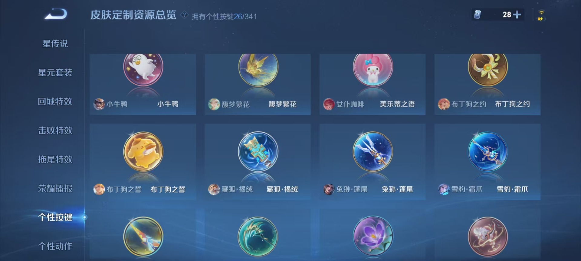 刘备时之恋人,李信一念神魔,镜炽阳神光,朵莉亚心动手记,宫本武藏惊梅引,裴擒虎祥瑞亨通,貂蝉猫影幻舞,张良黄金白羊座,孙悟空零号·赤焰,曜李逍遥,澜逐花归海,虞姬云霓雀翎,大乔挚爱花嫁,铠绛天战甲,干将莫邪久胜战神,孙策挚爱之约,达摩黄金狮子座,王昭君乞巧织情,夏洛特浮生妄,艾琳觅芳踪,马超无双飞将,云缨幻光神枪