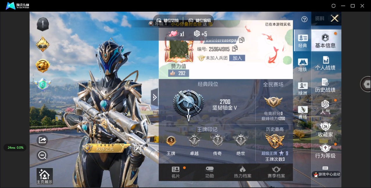- PX_2083755-贵族等级: V6 英雄数: 107 皮肤数: 80 传说皮: 淬星耀世,超时空战士-狄仁杰,幻光神枪 限定皮: 无尽星芒,五谷丰年