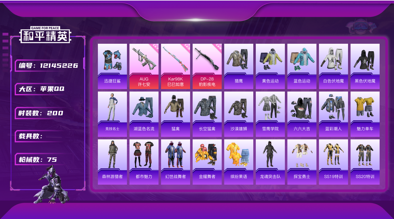 [12145226]3特效枪 3印记 可二次 可修改实名 优质装备:AUG-许七安,七级AUG-许七安,Kar98K-巳巳如意 热门装扮:迅捷狂鲨 稀有枪皮:DP-28-豹影疾电 五级特效枪:五级Kar98K-巳巳如意 四级特效枪:四级DP-28-豹影疾电 紫色装扮:SS31特训套装,SS33特训套装,幻世战舞者,乐音,六六大吉,甜心亚梦,虚音幻奏,猎梦纪元,SS20特训,SS19特训,魅力单车,黄色运动,黑色伏地魔,冰河战士,龙魂突击队,都市魅力,长空猛禽,雪鹰学院,无面战甲,湖蓝色名流,探宝勇士,柠萌假日,沙漠雄狮,缤纷果语,蓝彩潮人,蓝色运动,猎鹰,猛禽,白色伏地魔,SS29特训,雏菊兔兔,星途旅人,萝兰蝴蝶,SS28特训,鱼渊荷华,燕燕于飞,森林游猎者,智谋强哥,青团波波,竞技名士,许七安,临安公主,怀庆长公主,SS24特训(SS24特训套装),大橘大利,绯格组合,恋语绒绒,金耀舞者 优质战备:无垠阁降落伞,绯穹魔姬降落伞,临安公主降落伞,智耀战神降落伞