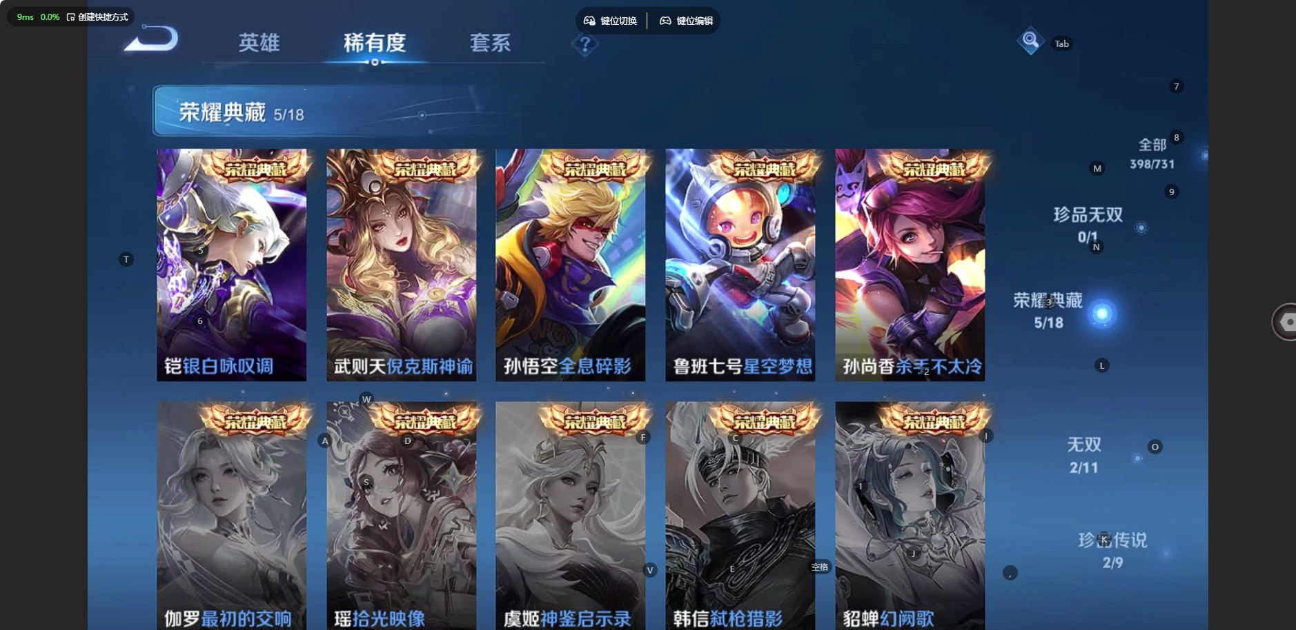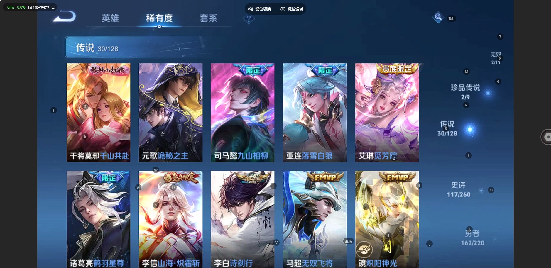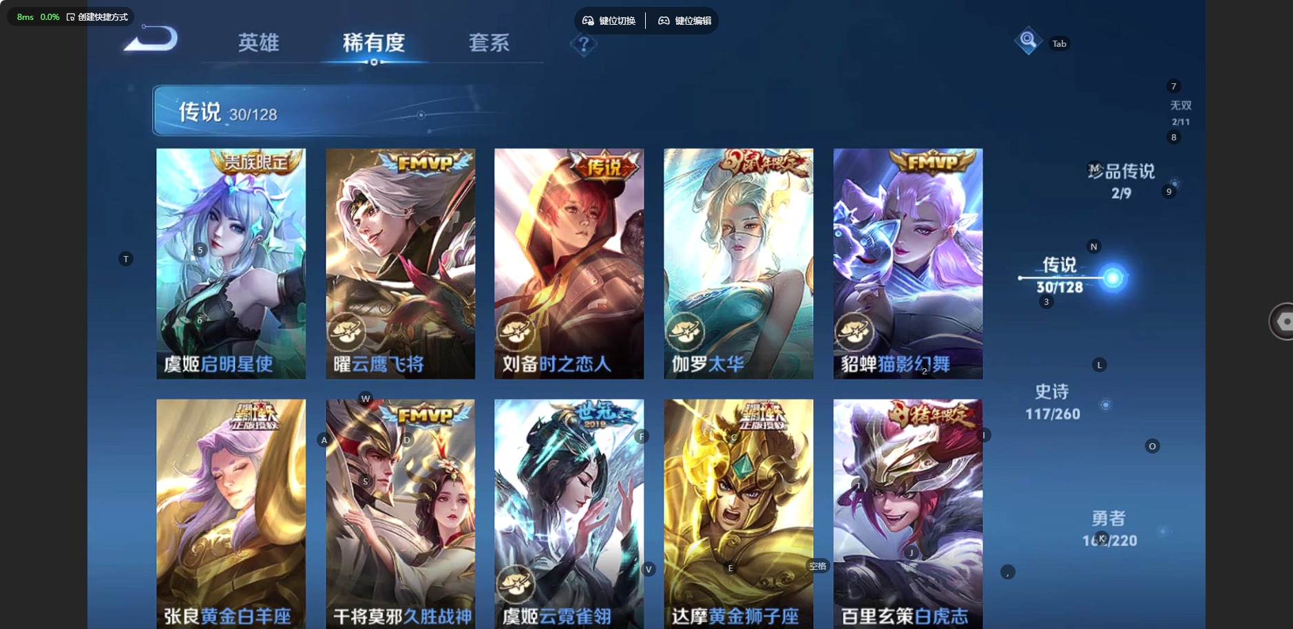 - [12166461]V8 16传说 124英雄 204皮肤 可修改实名 优质装备:黄金射手座,冠军飞将,一念神魔,末日机甲-孙尚香(绿蚂蚱),地狱火,仲夏夜之梦(大飞蛾),地狱之眼,胖达荣荣,超时空战士-狄仁杰,无双飞将,电玩·雷克斯,澜逐花归海 珍宝阁皮:万物之道 限定皮:愿照·九州拓(澜年限),鸣野蒿,白虎志(电光耗子),五谷丰年,青龙志(铠年限),梁祝,玄武志(苏烈年限),朱雀志(守约年限),引擎之心,冰霜恋舞曲 史诗皮:织梦人,紫霞仙子,电玩小子(小书包),白龙吟,黄金分割率,特工魅影,千年之狐,永昼,晚萤,末日机甲-吕布,猫狗日记-孙策,乱世虎臣,节奏热浪,修罗,水果甜心,星夜王子,心灵骇客,功夫厨神,德古拉伯爵,暗隐猎兽者,幽灵船长,鬼剑武藏,舞动绿茵,地狱岩魂,纤云弄巧,缤纷独角兽,乘风破浪,逐浪之夏,水晶猎龙者,箭羽风息,金属风暴,圣诞狂欢,圣诞恋歌,鹰眼统帅,暗夜贵公子,赏金猎手,无心