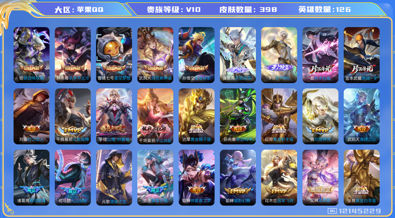 [12145229]V10 5典藏 2无双 2珍品传说 30传说 126英雄 398皮肤 典藏英雄武则天 可修改实名 优质装备:星空梦想(太空人),倪克斯神谕(宇宙婆娘),杀手不太冷,全息碎影(猴子典藏),银白咏叹调(倪克斯侍卫),碎月剑心(李白无双),天机白泽,朽木白哉,黑崎一护,黄金狮子座,黄金射手座,冠军飞将,云鹰飞将(小将军),黄金白羊座,猫影幻舞,久胜战神,炽阳神光,云霓雀翎,末日机甲-孙尚香(绿蚂蚱),地狱火,仲夏夜之梦(大飞蛾),海洋之心,时之恋人-刘备(电焊工),无双飞将,山海·炽霜斩(李信年限),鹤羽星尊,艾琳觅芳踪,诡秘之主,千山共赴,涂山容容 传说皮:落雪白狼,九山相柳 珍宝阁皮:优雅恋人,蔷薇恋人 限定皮:至尊宝,白虎志(电光耗子),凤求凰(白切鸡),凤凰于飞,太华(伽罗年限),武陵仙君(小桃花),傲雪梅枪,时之彼端,魔法小厨娘,飞衡(韩信年限),玄嵩(庄周年限),瑞麟志(木兰年限),高山流水,诗剑行,幽恒(沐浴露),梁祝,天狼狩猎者,岱宗(典韦年限),逐梦之音,天狼征服者,李小龙,逐梦之光,永曜之星,辉光之辰,如梦令-嫦娥,如梦令-后羿,一生所爱,大圣娶亲,天魔缭乱,冰霜恋舞曲,山海·玄木吟(马可年限) 史诗皮:赞萌露比,鸭鸭历险记-刘禅,化蝶舞,灵蛊蚀心,龙之律动,石田雨龙,百相守梦-周瑜,戍鼓铭心,幻珠鲛人,怒海争锋,蒙犽顽岩魄,百相守梦-黄忠,织梦人,遇见神鹿,紫霞仙子,苍穹之光,黄金分割率,特工魅影,千年之狐,江河有灵,魅语,百解令(蒙犽),蒙恬荣光圣徽,无限星赏官,冰冠公主,青蛇,偶像歌手,白蛇,晚萤,电玩·爆裂旋风,暗夜猫娘,龙骑士(小龙虾),末日机甲-吕布,猫狗日记-孙策,猫狗日记-大乔,时之恋人-孙尚香,乱世虎臣,节奏热浪,修罗,女仆咖啡,摇滚巨星,水果甜心,绅士熊喵,天才门将,星夜王子,心灵骇客,功夫厨神,德古拉伯爵,暗隐猎兽者,幽灵船长,鬼剑武藏,心灵战警,乐园奇幻夜,舞动绿茵,地狱岩魂,纤云弄巧,繁星吟游(呼啦呼啦),拒霜思,缤纷独角兽,乘风破浪,逐浪之夏,月团寄思,水晶猎龙者,曙光守护者,箭羽风息,金属风暴,原初追逐者,圣诞狂欢,圣诞恋歌,鹰眼统帅,暗夜贵公子,魅力维加斯,黎明之约,无心,未来纪元-赵云