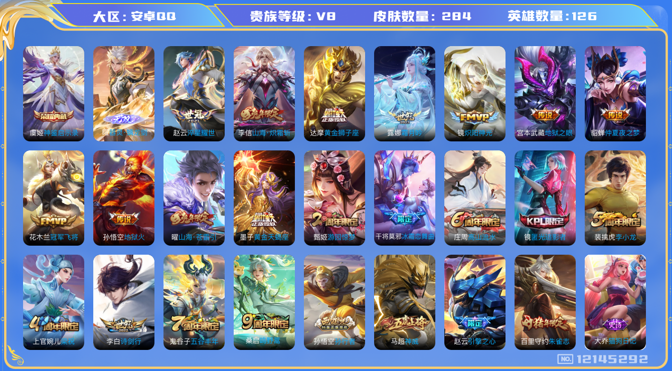 [12145292]V8 1典藏 1无双 14传说 126英雄 284皮肤 可修改实名 优质装备:神鉴启示录,器灵·螭龙剑,黄金狮子座,冠军飞将,炽阳神光,地狱火,仲夏夜之梦(大飞蛾),地狱之眼,淬星耀世,山海·炽霜斩(李信年限),山海·苍雷引(电光曜子),霜月吟,黄金天蝎座,涂山容容 珍宝阁皮:优雅恋人,女武神,玩趣恶龙 限定皮:鸣野蒿,神威(电光马子),高山流水,诗剑行,五谷丰年,游园惊梦,梁祝,李小龙,朱雀志(守约年限),孙行者,引擎之心,冰霜恋舞曲,匿光追影者 史诗皮:器灵·浮梦炉,化蝶舞,龙之律动,星界战将,百相守梦-黄忠,埋骨钱,破空之剑,东方月初,蒙犽顽岩魄,海诺心动手记,电玩小子(小书包),白龙吟,黄金分割率,特工魅影,千年之狐,江河有灵,蒙恬荣光圣徽,电玩·爆裂旋风,无限星赏官,晚萤,偶像歌手,百相守梦(关羽),暗夜猫娘,末日机甲-吕布,猫狗日记-孙策,猫狗日记-大乔,乱世虎臣,节奏热浪,修罗,女仆咖啡,摇滚巨星,水果甜心,绅士熊喵,天才门将,星夜王子,功夫厨神,德古拉伯爵,暗隐猎兽者,幽灵船长,鬼剑武藏,心灵战警,舞动绿茵,地狱岩魂,纤云弄巧,繁星吟游(呼啦呼啦),拒霜思,缤纷独角兽,乘风破浪,逐浪之夏,水晶猎龙者,曙光守护者,金属风暴,原初追逐者,圣诞恋歌,鹰眼统帅,暗夜贵公子,魅力维加斯,黎明之约,无心,未来纪元-赵云