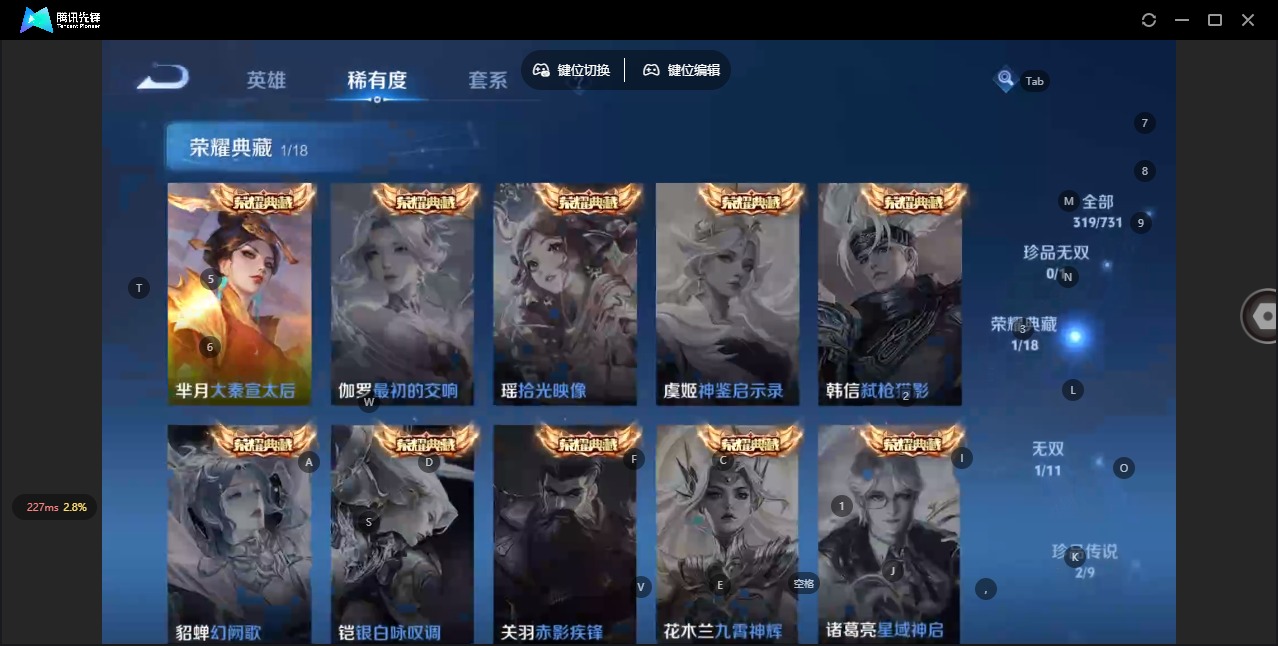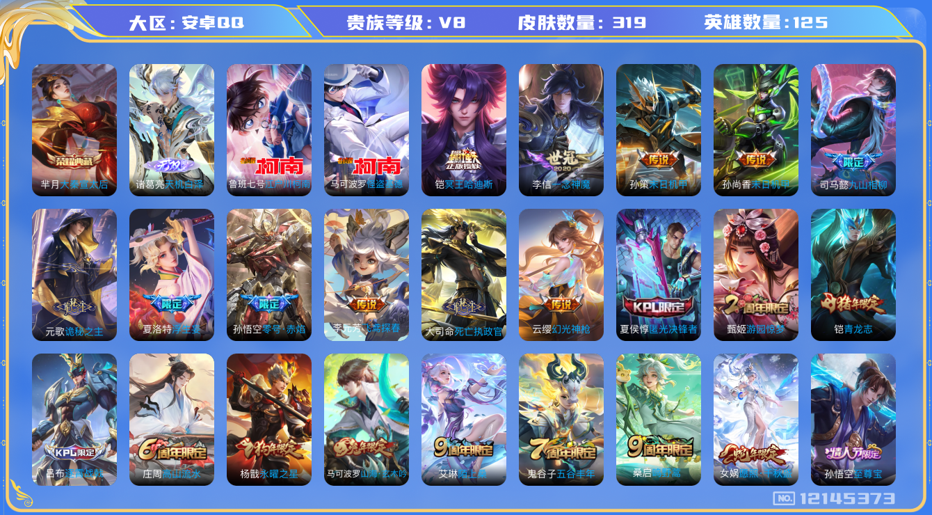 [12145373]V8 1典藏 1无双 2珍品传说 20传说 125英雄 319皮肤 可修改实名 优质装备:大秦宣太后,天机白泽,江户川柯南,怪盗基德,一念神魔,末日机甲-孙尚香(绿蚂蚱),零号·赤焰,飞鸢探春,末日机甲-孙策,浮生妄,诡秘之主 传说皮:死亡执政官,九山相柳,铠冥王哈迪斯,幻光神枪 珍宝阁皮:妄想食味,优雅恋人 限定皮:愿照·九州拓(澜年限),愿照·岁时盈(虞姬年限),愿照·众生和(妲己年限),愿照·千秋盛(女娲年限),逐霄战戟,映山客,陌上桑,鸣野蒿,至尊宝,山海·碧波行(瑶年限),高山流水,匿光决锋者,降魔,五谷丰年,青龙志(铠年限),游园惊梦,永曜之星,枫霜尽,山海·玄木吟(马可年限) 史诗皮:赞萌露比,鸭鸭历险记-刘禅,器灵·浮梦炉,狼魂孤将,绮世丹青,瑰影绮梦,化蝶舞,星界战将,谪仙醉月,龙之律动,雪豹·霜爪,石田雨龙,百相守梦-周瑜,戍鼓铭心,茶境仙,怒海争锋,破空之剑,战舞者,涂山红红,东方月初,埋骨钱,蔬乡物语(鲁班七号),百相守梦-百里守约,星界特工,百相守梦-黄忠,织梦人,守夜人,电玩小子(小书包),白龙吟,黄金分割率,特工魅影,永昼,江河有灵,匿光侦查者,蒙恬荣光圣徽,冰冠公主,偶像歌手,乱世虎臣,节奏热浪,修罗,摇滚巨星,水果甜心,绅士熊喵,心灵骇客,时之奇旅-安琪拉,功夫厨神,德古拉伯爵,幽灵船长,鬼剑武藏,暗渊魔法,心灵战警,乐园奇幻夜,天秀·启明,地狱岩魂,拒霜思,缤纷独角兽,乘风破浪,水晶猎龙者,曙光守护者,箭羽风息,金属风暴,原初追逐者,圣诞狂欢,圣诞恋歌,鹰眼统帅,魅力维加斯,黎明之约,赏金猎手,天秀·音浪,无心,未来纪元-赵云