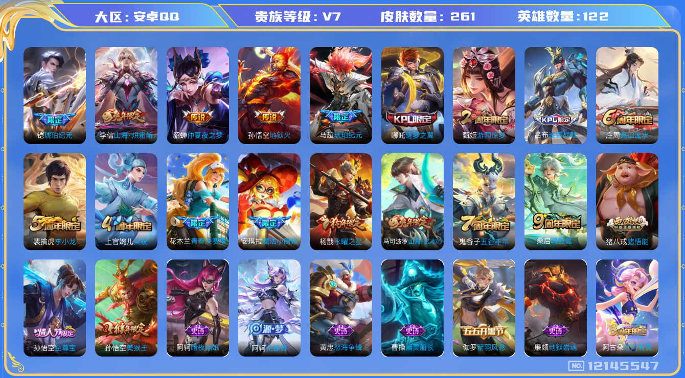 [12145547]V7 7传说 122英雄 261皮肤 可修改实名 优质装备:地狱火,仲夏夜之梦(大飞蛾),山海·炽霜斩(李信年限),琥珀纪元铠,琥珀纪元马超 珍宝阁皮:万物之道,优雅恋人,蔷薇恋人 限定皮:逐霄战戟,鸣野蒿,至尊宝,魔法小厨娘,高山流水,五谷丰年,游园惊梦,梁祝,逐梦之翼,李小龙,永曜之星,猪悟能,青春决赛季,美猴王,山海·玄木吟(马可年限) 史诗皮:化蝶舞,怒海争锋,埋骨钱,芈月浮光幕影,紫霞仙子,苍穹之光,白龙吟,黄金分割率,特工魅影,千年之狐,江河有灵,魅语,蒙恬荣光圣徽,偶像歌手,暗夜猫娘,龙骑士(小龙虾),末日机甲-吕布,修罗,女仆咖啡,水果甜心,绅士熊喵,星夜王子,心灵骇客,功夫厨神,幽灵船长,鬼剑武藏,心灵战警,舞动绿茵,地狱岩魂,纤云弄巧,逐浪之夏,水晶猎龙者,箭羽风息,金属风暴,原初追逐者,圣诞狂欢,圣诞恋歌,鹰眼统帅,黎明之约,赏金猎手,无心