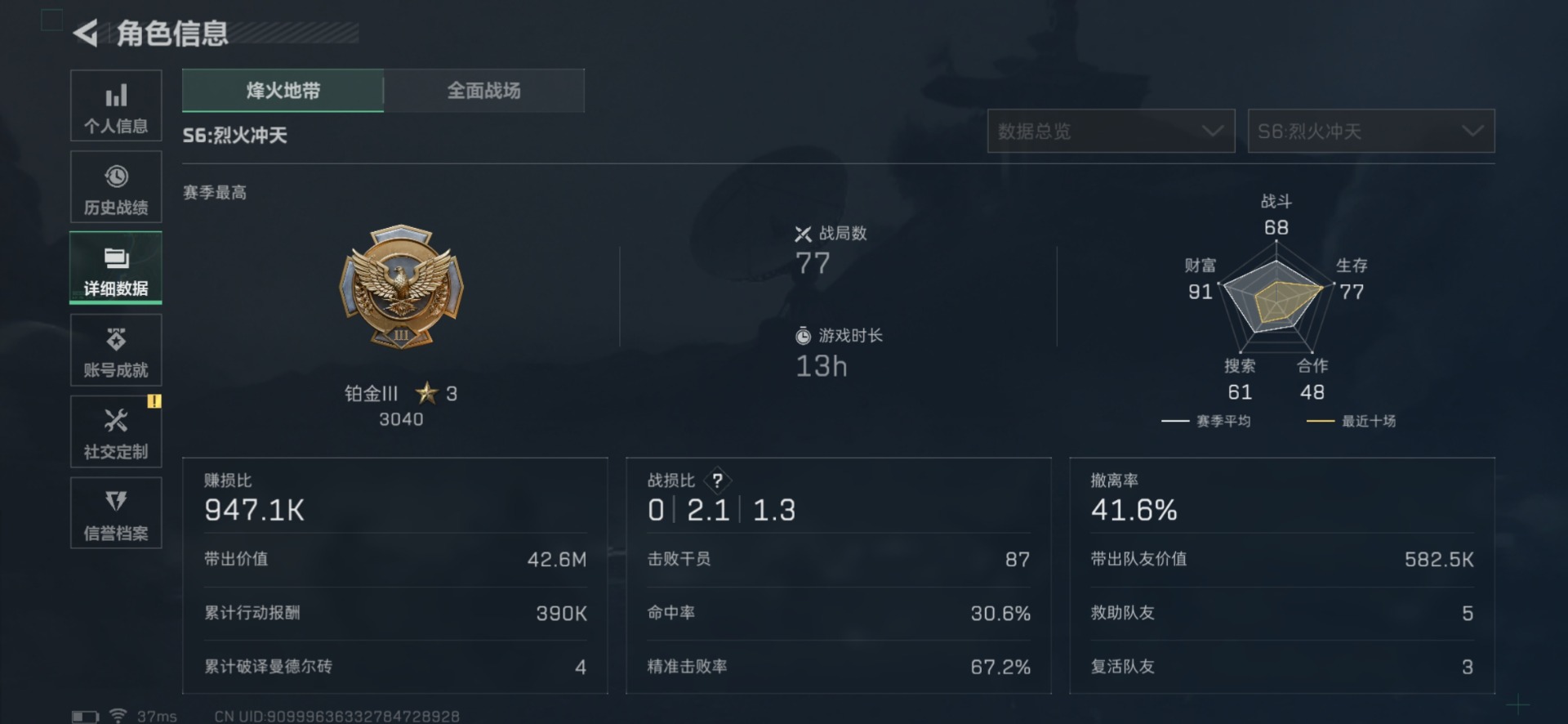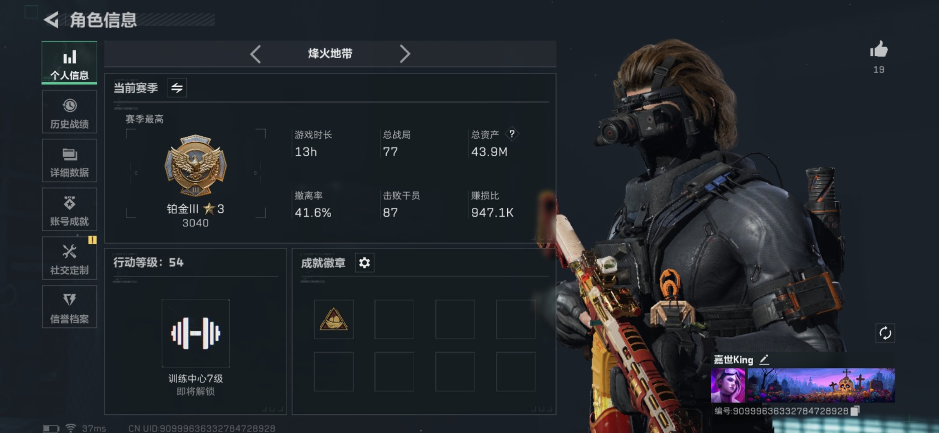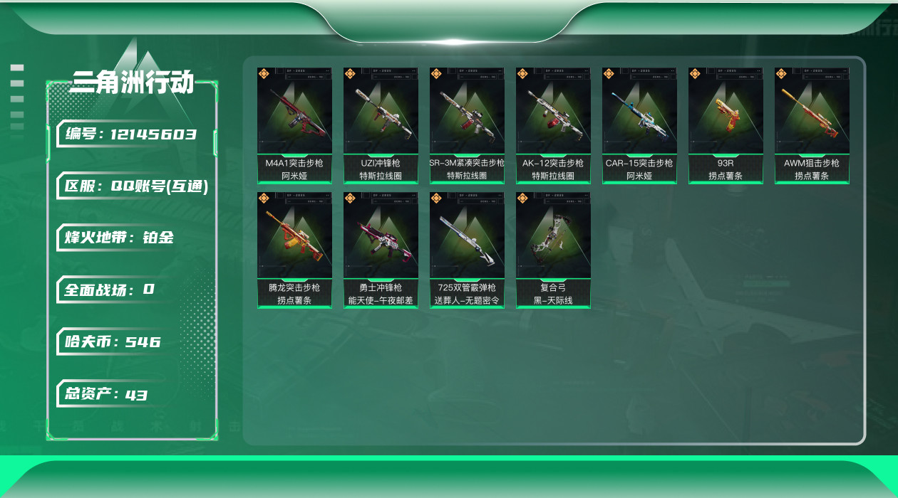 [12145603]总资产:43.9M 11传说枪械 哈夫币:546.073K 可二次 可修改实名 烽火地带段位:铂金 全面战场段位:无段位 传说武器皮肤:AK-12突击步枪-特斯拉线圈,SR-3M紧凑突击步枪-特斯拉线圈,UZI冲锋枪-特斯拉线圈,勇士冲锋枪-能天使-午夜邮差,腾龙突击步枪-捞点薯条,93R-捞点薯条,AWM狙击步枪-捞点薯条,725双管霰弹枪-送葬人-无题密令,M4A1突击步枪-阿米娅,CAR-15突击步枪-阿米娅,复合弓-黑-天际线