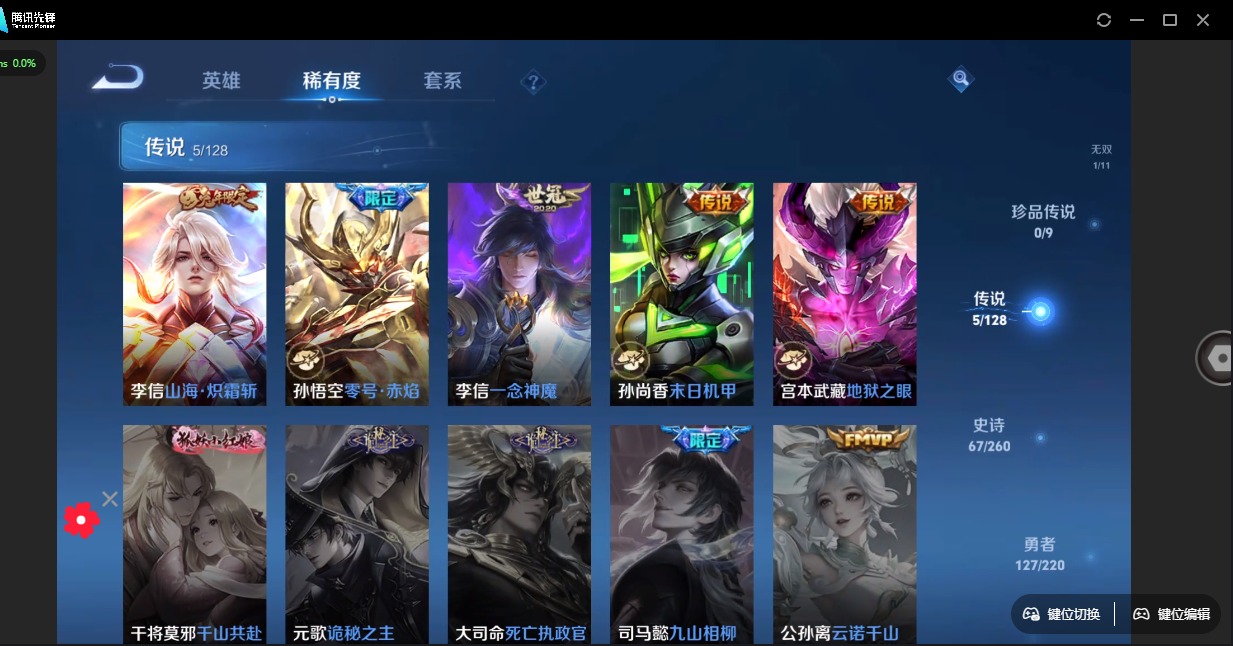 - [12205078]V7 4传说 110英雄 116皮肤 可修改实名 优质装备:炽阳神光 传说皮:乘龙·淬吴钩(孙策年限) 珍宝阁皮:蔷薇恋人 限定皮:逐霄战戟,鸣野蒿,齐天大圣,五谷丰年,游园惊梦 史诗皮:琥珀纪元伽罗,战舞者,东方月初,芈月浮光幕影,怒海争锋,黄金分割率,特工魅影,浮梦罗烟,江河有灵,百解令(蒙犽),高渐离燃音魔法,蒙恬荣光圣徽,电玩·爆裂旋风,末日机甲-吕布,水果甜心,功夫厨神,暗隐猎兽者,鬼剑武藏,心灵战警,舞动绿茵,曙光守护者,金属风暴,未来纪元-赵云