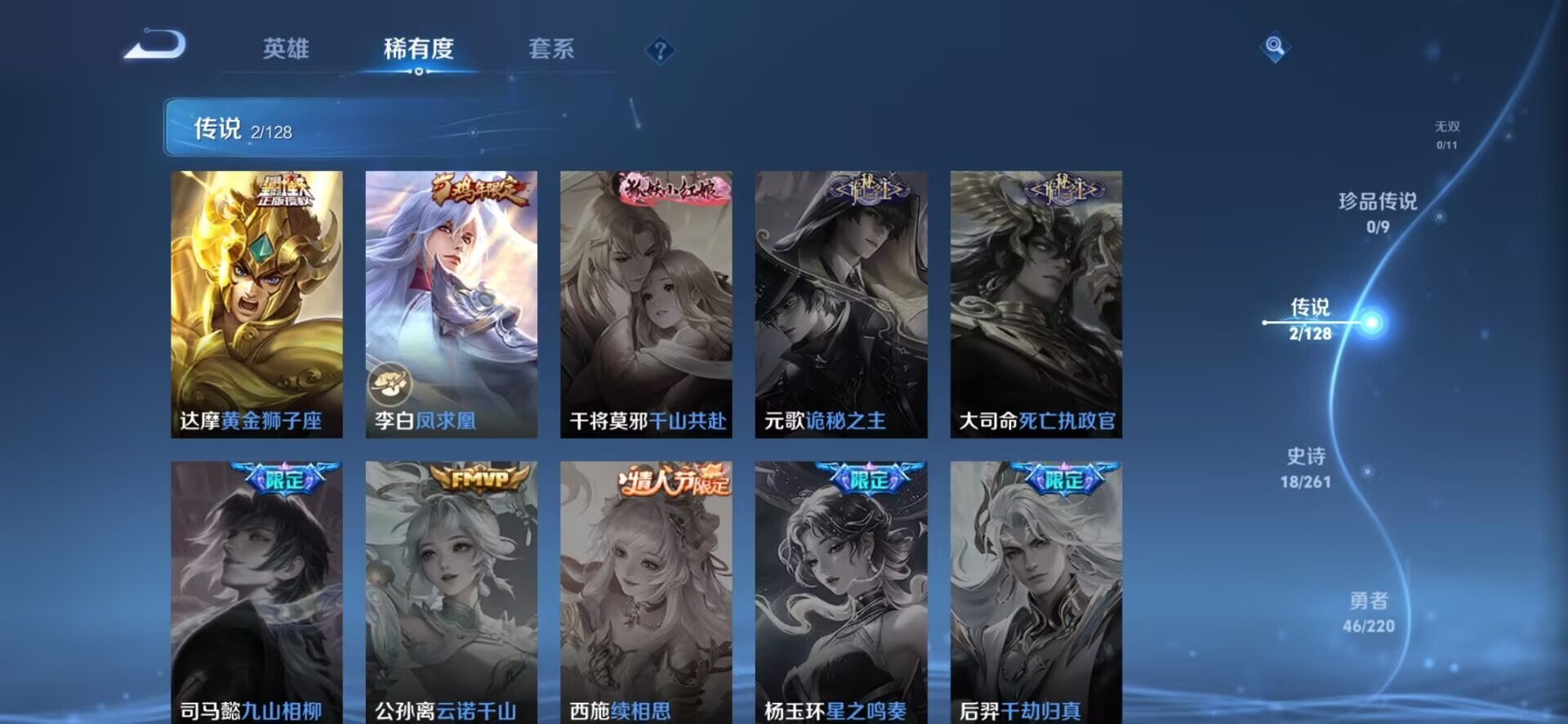 - PX_2085567-82 安卓QQ/至尊星耀/314皮肤/125英雄/1典藏/0珍品无双/0无双/1珍品传说/21传说/98史诗/9稀有英雄 【1 珍品传说】怪盗基德 马可波罗, 【1 典藏皮肤】鸣剑·曳影 李白, 【21 传说皮肤】武圣 关羽,启明星使 虞姬,逐花归海 澜,无双飞将 马超,零号·赤焰 孙悟空,云鹰飞将 曜,深海之息 马可波罗,鹤羽星尊 诸葛亮,炽阳神光 镜,怒海麟威 吕布,时之