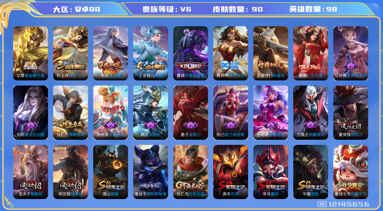 [12145656]V6 2传说 98英雄 90皮肤 可修改实名 优质装备:黄金狮子座 限定皮:凤求凰(白切鸡),遇见飞天,梁祝,天狼征服者,朱雀志(守约年限),一生所爱,神奇女侠 史诗皮:白龙吟,无限星赏官,偶像歌手,龙骑士(小龙虾),水果甜心,德古拉伯爵,鹰眼统帅,魅力维加斯