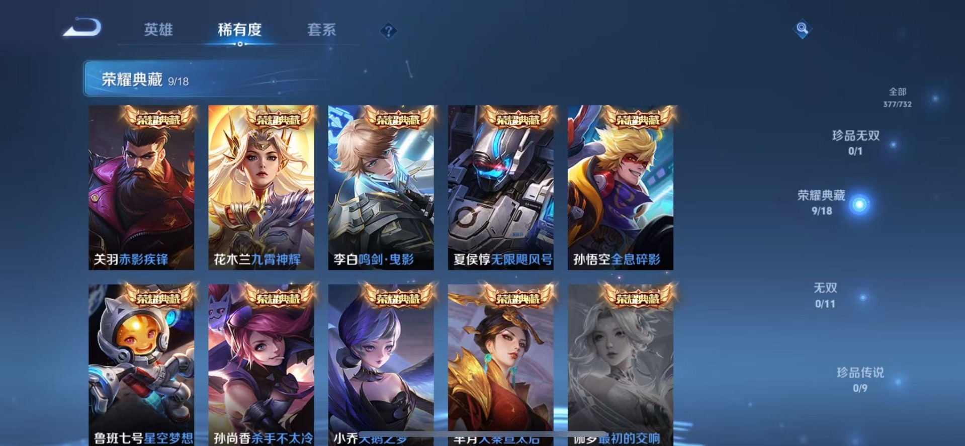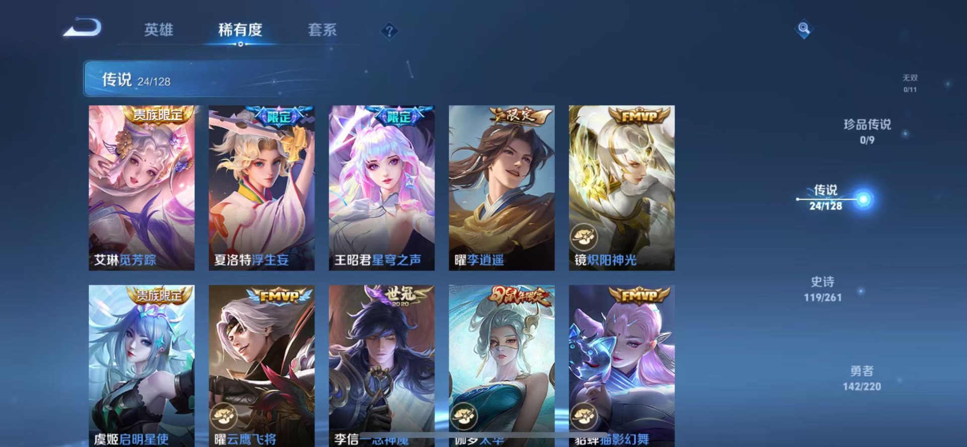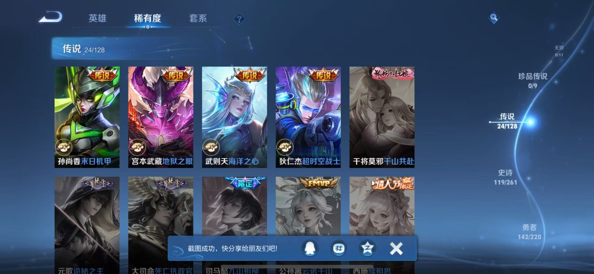 - PX_2025694-贵族等级: V8 英雄数: 124 皮肤数: 292 荣耀水晶: 九霄神辉,赤影疾锋 珍品传说: 怪盗基德,器灵·落星盏 传说皮: 云鹰飞将,黄金白羊座,久胜战神,一念神魔,地狱火,仲夏夜之梦,游龙清影,末日机甲-孙策,碎云,山海·炽霜斩,炽翼辉光,乘龙·问璇玑,乘龙·淬吴钩,典韦战鼓燎原 限定皮: 梁祝,时雨天司,辉光之辰,孙行者,时之奇旅-妲己,星穹之声,五谷丰年,降魔,