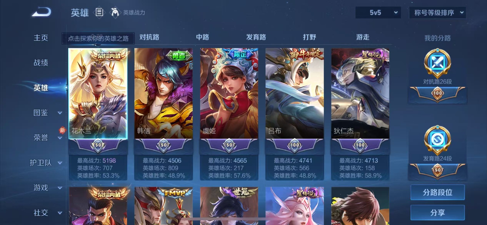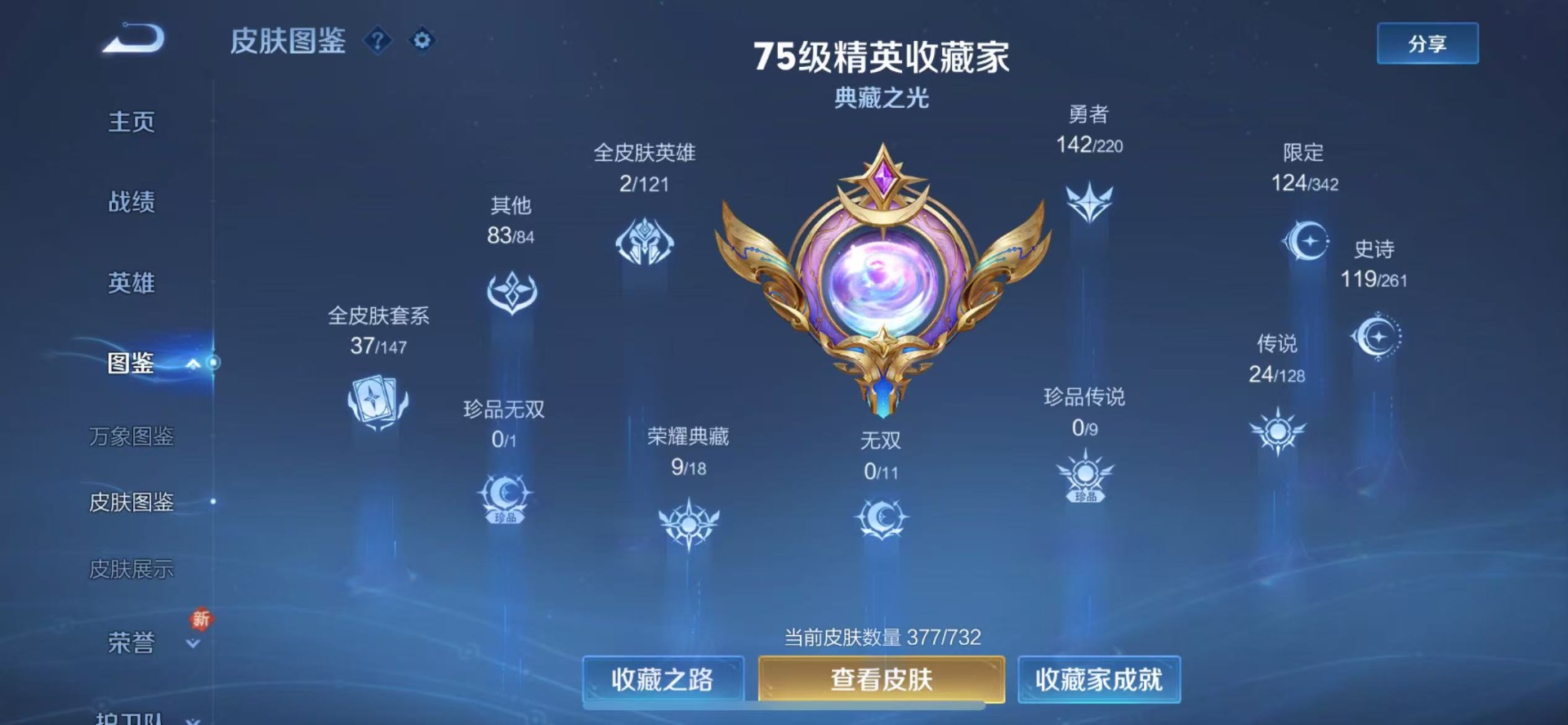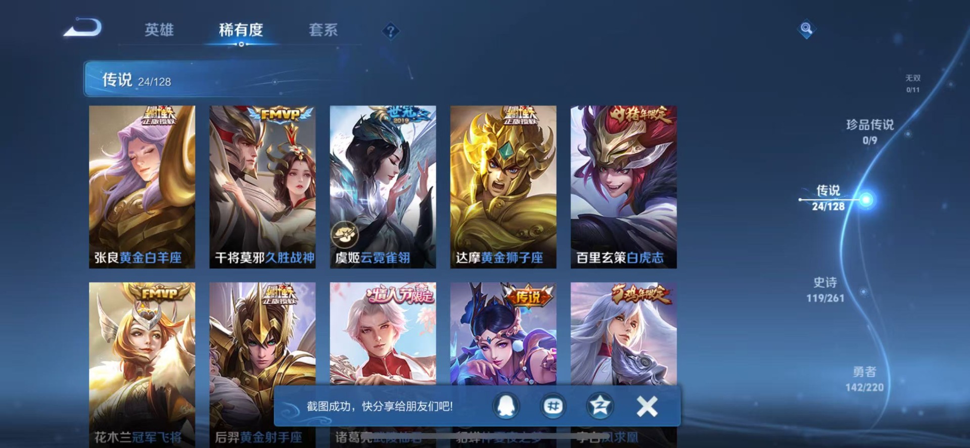 - PX_2025694-贵族等级: V8 英雄数: 124 皮肤数: 292 荣耀水晶: 九霄神辉,赤影疾锋 珍品传说: 怪盗基德,器灵·落星盏 传说皮: 云鹰飞将,黄金白羊座,久胜战神,一念神魔,地狱火,仲夏夜之梦,游龙清影,末日机甲-孙策,碎云,山海·炽霜斩,炽翼辉光,乘龙·问璇玑,乘龙·淬吴钩,典韦战鼓燎原 限定皮: 梁祝,时雨天司,辉光之辰,孙行者,时之奇旅-妲己,星穹之声,五谷丰年,降魔,