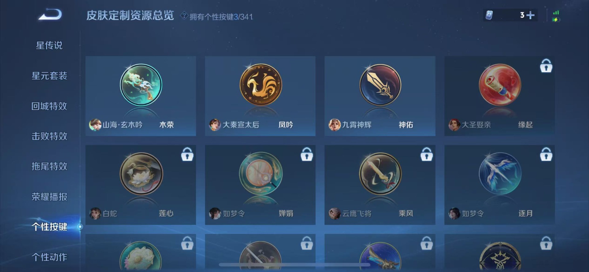 刘邦夺宝奇兵,夏侯惇朔风刀,老夫子醍醐杖,沈梦溪星空之诺,沈梦溪大漠名商,盾山御銮,曹操烛龙,苏烈千军破阵,典韦穷奇,典韦蓝屏警告,达摩沙漠行僧,牛魔御旌,鲁班七号狮舞东方,吕布猎兽之王,元歌云间偶戏,兰陵王金庭之子,裴擒虎擒涛扼浪,鲁班大师探海日志,明世隐疑决卦,蒙犽狂想玩偶喵,马可波罗暗影游猎,白起狰,鬼谷子原初探秘者,张良古海寻踪,女娲朔望之晖,桑启海盐诗旅,狄仁杰万华元夜,嬴政白昼王子,芈月重明,程咬金演武夺筹,扁鹊炼金王,李元芳银河之约,李元芳云中旅人,弈星混沌棋,虞姬凯尔特女王,米莱狄御霄,钟馗神迹守卫,钟馗驱傩正仪,狂铁御狮,太乙真人饕餮
