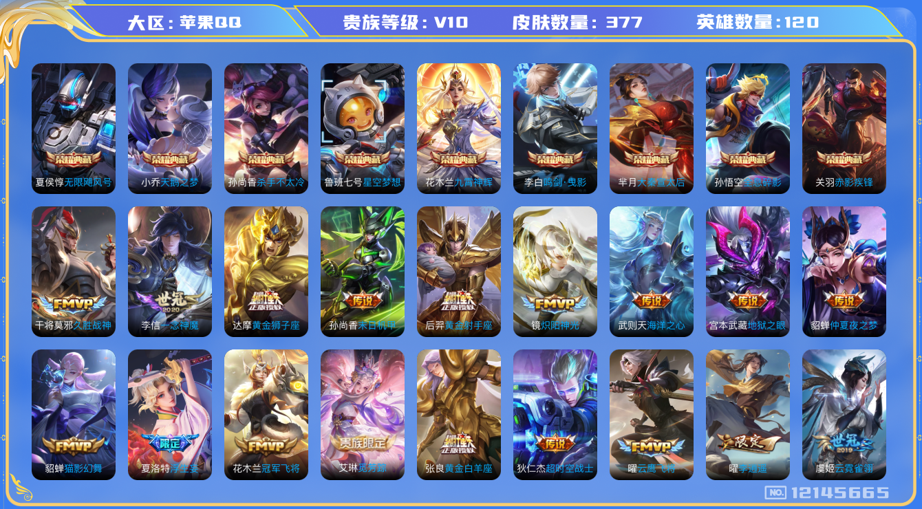 [12145665]V10 9典藏 24传说 120英雄 377皮肤 典藏英雄武则天 可修改实名 女号 优质装备:天鹅之梦(小乔典藏),星空梦想(太空人),无限飓风号(高达),杀手不太冷,大秦宣太后,鸣剑·曳影,全息碎影(猴子典藏),九霄神辉(木兰典藏),赤影疾锋,黄金狮子座,黄金射手座,冠军飞将,云鹰飞将(小将军),黄金白羊座,猫影幻舞,久胜战神,炽阳神光,一念神魔,云霓雀翎,末日机甲-孙尚香(绿蚂蚱),仲夏夜之梦(大飞蛾),海洋之心,地狱之眼,李逍遥,超时空战士-狄仁杰,浮生妄,艾琳觅芳踪 珍宝阁皮:优雅恋人,女武神 限定皮:至尊宝,白虎志(电光耗子),凤求凰(白切鸡),凤凰于飞,太华(伽罗年限),武陵仙君(小桃花),星穹之声,时之彼端,魔法小厨娘,飞衡(韩信年限),玄嵩(庄周年限),遇见飞天,高山流水,五谷丰年,冰锋战神,幽恒(沐浴露),游园惊梦,梁祝,御风骁将(吕布年限),天狼狩猎者,逐梦之翼,逐梦之星,岱宗(典韦年限),天狼征服者,李小龙,逐梦之影,辉光之辰,霸王别姬-项羽,霸王别姬-虞姬,奇迹圣诞,默契交锋-花木兰,孙行者,猪悟能,青春决赛季,冰霜恋舞曲,蜜橘之夏,神奇女侠,山海·玄木吟(马可年限) 史诗皮:遇见神鹿,紫霞仙子,苍穹之光,电玩小子(小书包),白龙吟,黄金分割率,特工魅影,千年之狐,江河有灵,魅语,蒙恬荣光圣徽,无限星赏官,冰冠公主,青蛇,偶像歌手,白蛇,晚萤,暗夜猫娘,龙骑士(小龙虾),末日机甲-吕布,猫狗日记-孙策,猫狗日记-大乔,时之恋人-孙尚香,乱世虎臣,节奏热浪,修罗,女仆咖啡,摇滚巨星,水果甜心,绅士熊喵,天才门将,星夜王子,心灵骇客,时之奇旅-安琪拉,功夫厨神,德古拉伯爵,暗隐猎兽者,幽灵船长,鬼剑武藏,心灵战警,舞动绿茵,地狱岩魂,诗语江南,纤云弄巧,繁星吟游(呼啦呼啦),拒霜思,缤纷独角兽,乘风破浪,逐浪之夏,水晶猎龙者,曙光守护者,箭羽风息,金属风暴,原初追逐者,圣诞狂欢,圣诞恋歌,鹰眼统帅,暗夜贵公子,魅力维加斯,黎明之约,无心,