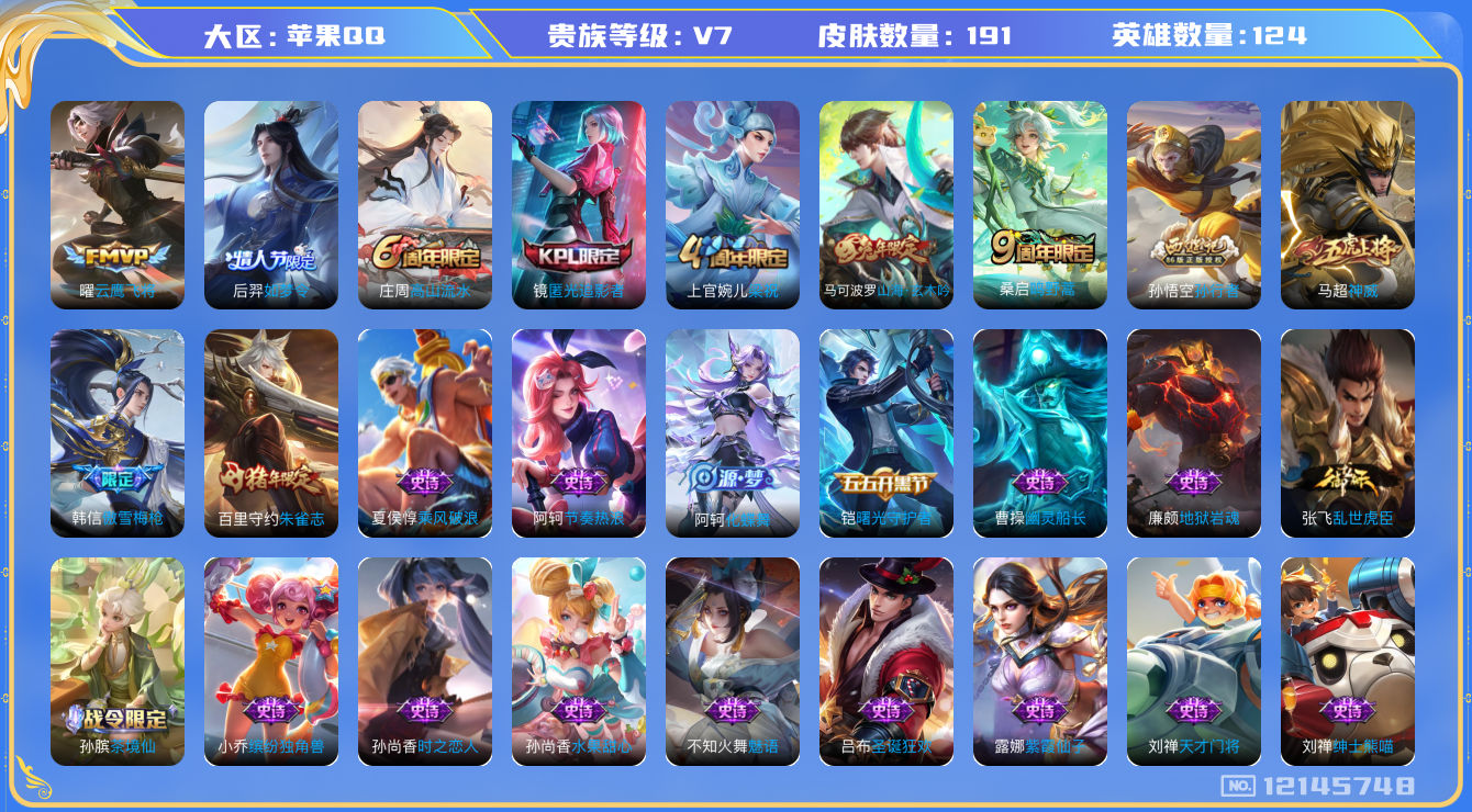 [12145748]V7 2传说 124英雄 191皮肤 可修改实名 优质装备:云鹰飞将(小将军) 珍宝阁皮:玩趣恶龙 限定皮:鸣野蒿,傲雪梅枪,神威(电光马子),高山流水,梁祝,朱雀志(守约年限),如梦令-后羿,孙行者,匿光追影者,山海·玄木吟(马可年限) 史诗皮:化蝶舞,龙之律动,茶境仙,谪仙醉月,紫霞仙子,特工魅影,千年之狐,永昼,冰冠公主,魅语,晚萤,偶像歌手,时之恋人-孙尚香,乱世虎臣,节奏热浪,修罗,女仆咖啡,摇滚巨星,水果甜心,绅士熊喵,天才门将,时之奇旅-安琪拉,功夫厨神,暗隐猎兽者,幽灵船长,鬼剑武藏,乐园奇幻夜,舞动绿茵,地狱岩魂,纤云弄巧,拒霜思,缤纷独角兽,乘风破浪,逐浪之夏,水晶猎龙者,曙光守护者,热力回旋,金属风暴,圣诞狂欢,鹰眼统帅,未来纪元-赵云