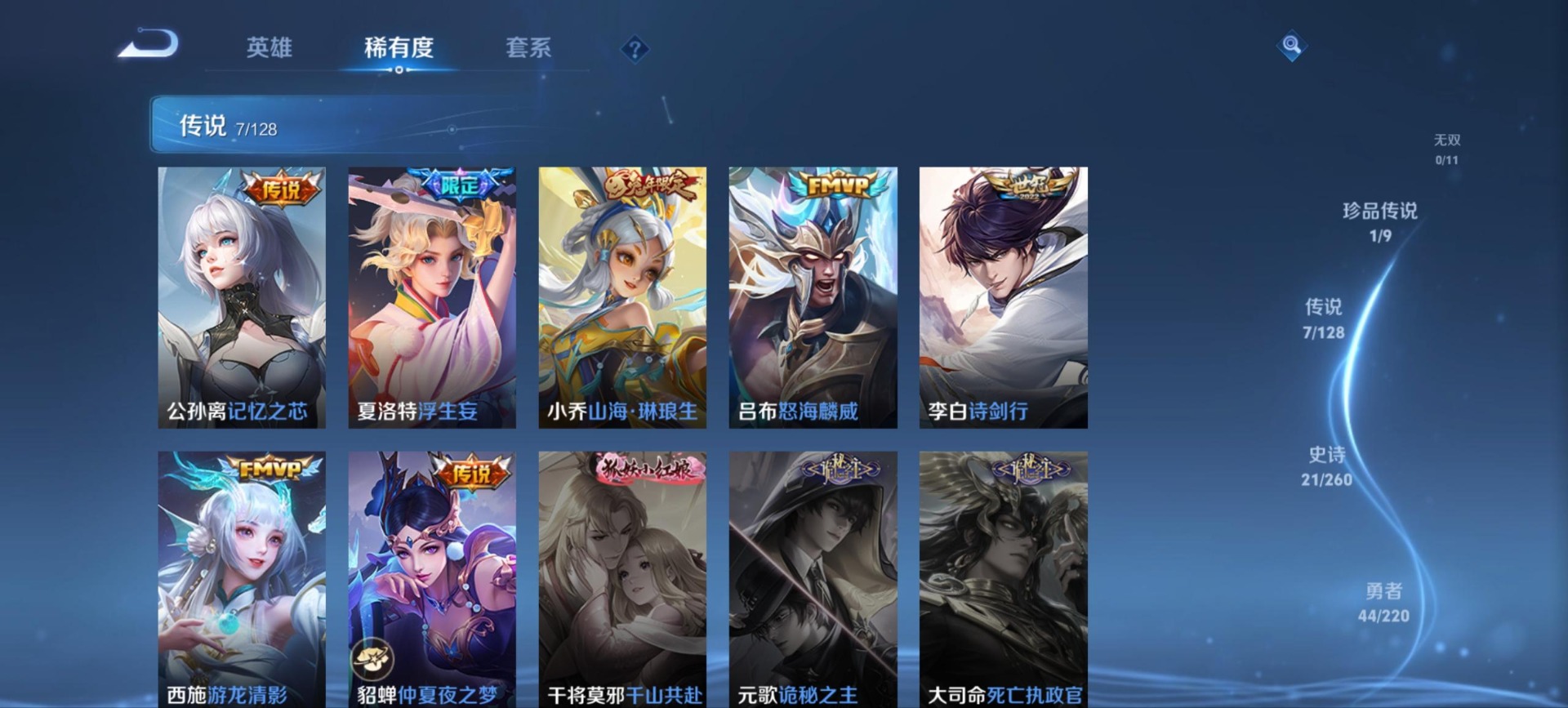 - [11941364]V6 2珍品传说 6传说 117英雄 108皮肤 可修改实名 优质装备:器灵·落星盏,酷洛米之心,黄金狮子座,久胜战神,炽阳神光 珍宝阁皮:蔷薇恋人 限定皮:愿照·岁时盈(虞姬年限),愿照·千秋盛(女娲年限),梁祝,祈雪灵祝(雪兔子),李小龙,引擎之心 史诗皮:鸭鸭历险记-刘禅,器灵·浮梦炉,化蝶舞,龙之律动,茶境仙,紫霞仙子,特工魅影,偶像歌手,节奏热浪,水果甜心,星夜王子,心灵骇客,暗隐猎兽者,鬼剑武藏,舞动绿茵,纤云弄巧,缤纷独角兽,水晶猎龙者,箭羽风息,金属风暴,圣诞狂欢,鹰眼统帅,魅力维加斯