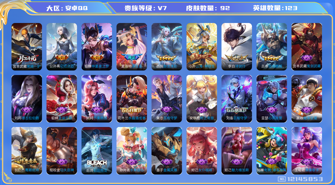 [12145853]V7 1珍品传说 7传说 123英雄 92皮肤 可修改实名 优质装备:黑崎一护,仲夏夜之梦(大飞蛾),游龙清影(小青龙),山海·琳琅生(小乔年限),浮生妄,记忆之芯(机甲兔) 限定皮:诗剑行,怒海麟威 史诗皮:石田雨龙,百相守梦-黄忠,偶像歌手,电玩·爆裂旋风,百相守梦(刘备),节奏热浪,女仆咖啡,摇滚巨星,水果甜心,时之奇旅-安琪拉,功夫厨神,德古拉伯爵,鬼剑武藏,心灵战警,水晶猎龙者,金属风暴,圣诞恋歌,鹰眼统帅,魅力维加斯