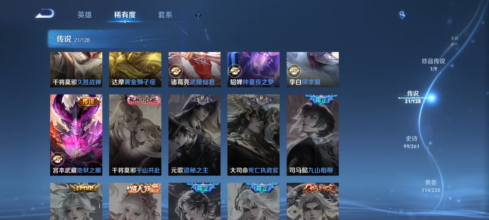 - PX_2091254-贵族8/皮肤237/典藏1/传说17/史诗66/英雄125/鸣剑曳影/公孙离离恨烟/瑶大耳狗之梦/蔷薇恋人/优雅恋人/特工战影/超时空战士男/末日机甲女/胖达荣荣/一念神魔/云鹰飞将/零号赤焰/启明星使/音你心动男/游龙清影/淬星耀世/无双飞将/逐花归海/黄金天蝎座/桑启鸣野蒿/云缨幻光神枪/女娲愿照千秋盛/司空震愿照山河定/狰/公孙离离恨烟/暃埋骨钱/蒙犽顽岩魄/蔡文姬夏日