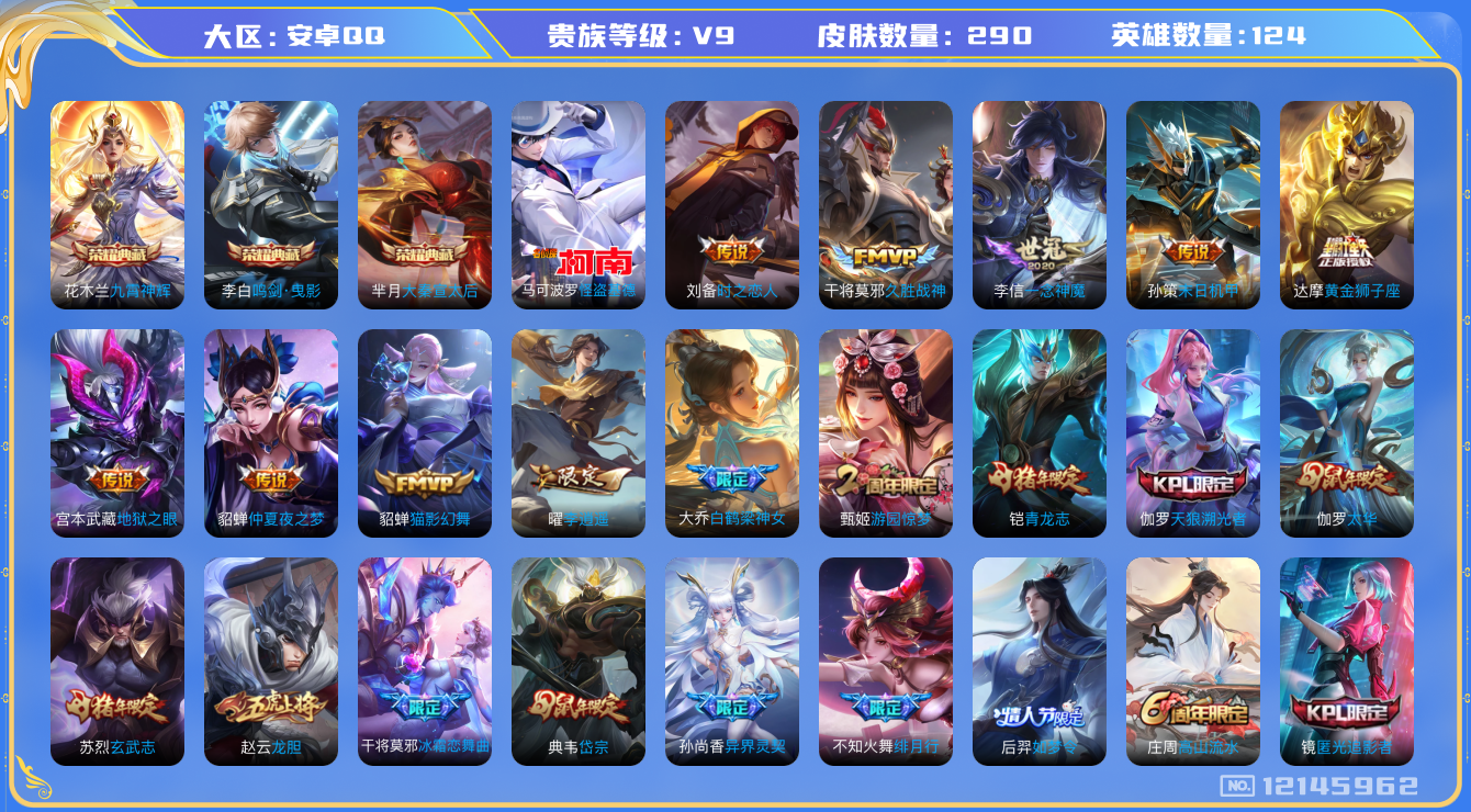 [12145962]V9 3典藏 1珍品传说 21传说 124英雄 290皮肤 可修改实名 优质装备:大秦宣太后,鸣剑·曳影,九霄神辉(木兰典藏),怪盗基德,黄金狮子座,猫影幻舞,久胜战神,一念神魔,仲夏夜之梦(大飞蛾),地狱之眼,李逍遥,时之恋人-刘备(电焊工),末日机甲-孙策,涂山容容 珍宝阁皮:妄想食味,优雅恋人 限定皮:凤求凰(白切鸡),太华(伽罗年限),武陵仙君(小桃花),异界灵契(白毛香),前尘镜,星穹之声,绯月行,时之彼端,白鹤梁神女,时雨天司(水龙头),神威(电光马子),飞衡(韩信年限),遇见飞天,高山流水,诗剑行,五谷丰年,青龙志(铠年限),游园惊梦,梁祝,龙胆,逐梦之星,岱宗(典韦年限),天狼溯光者,祈雪灵祝(雪兔子),天狼绘梦者,李小龙,玄武志(苏烈年限),朱雀志(守约年限),如梦令-后羿,默契交锋-花木兰,孙行者,猪悟能,大圣娶亲,青春决赛季,冰霜恋舞曲,神奇女侠,匿光追影者,深海之息(深海大菠萝),神器·万象笔 史诗皮:星界战将,紫霞仙子,苍穹之光,电玩小子(小书包),白龙吟,特工魅影,千年之狐,永昼,魅语,高渐离燃音魔法,蒙恬荣光圣徽,无限星赏官,冰冠公主,偶像歌手,晚萤,暗夜猫娘,龙骑士(小龙虾),末日机甲-吕布,猫狗日记-孙策,时之恋人-孙尚香,乱世虎臣,节奏热浪,修罗,女仆咖啡,摇滚巨星,水果甜心,星夜王子,心灵骇客,功夫厨神,德古拉伯爵,暗隐猎兽者,幽灵船长,鬼剑武藏,心灵战警,舞动绿茵,诗语江南,纤云弄巧,繁星吟游(呼啦呼啦),拒霜思,缤纷独角兽,乘风破浪,逐浪之夏,水晶猎龙者,曙光守护者,金属风暴,原初追逐者,圣诞狂欢,圣诞恋歌,鹰眼统帅,暗夜贵公子,魅力维加斯,黎明之约,无心,未来纪元-赵云