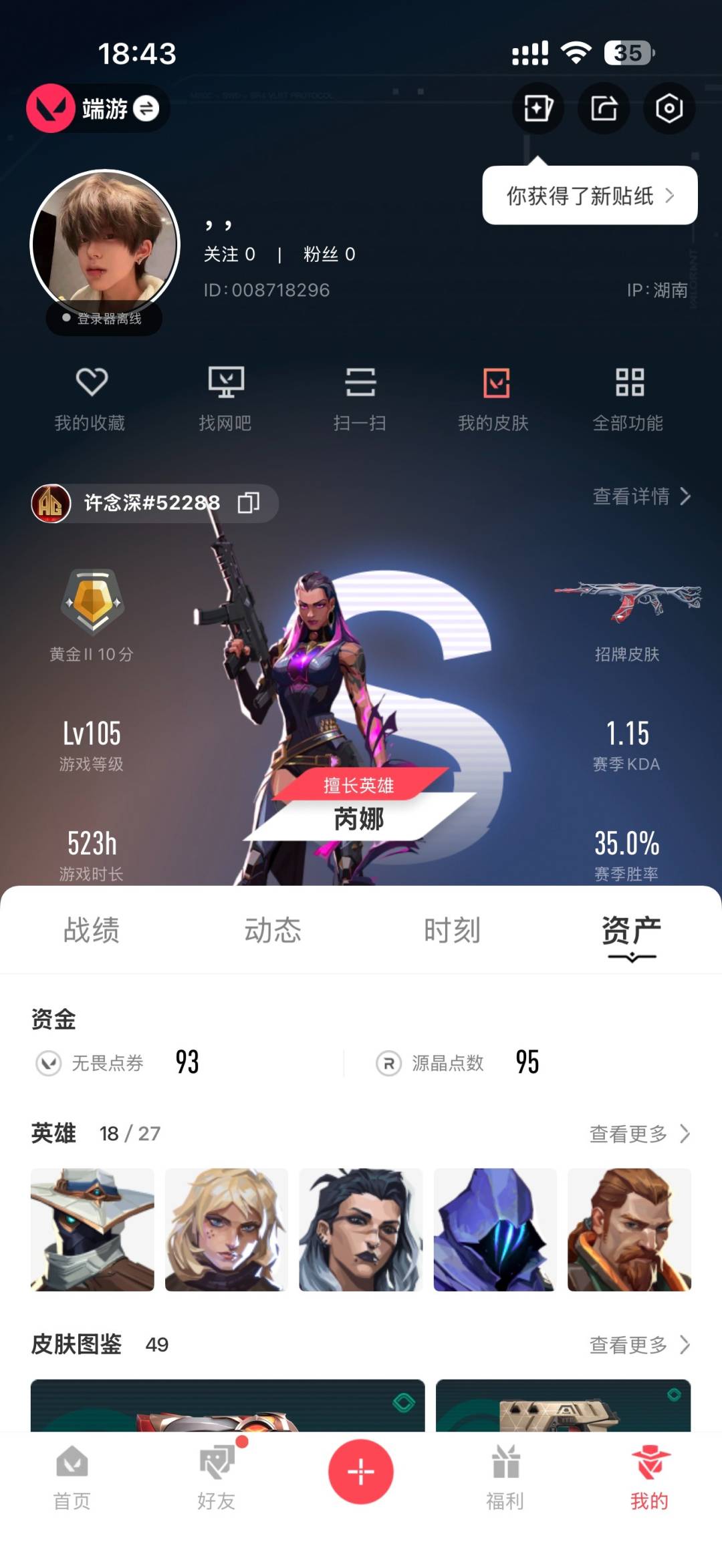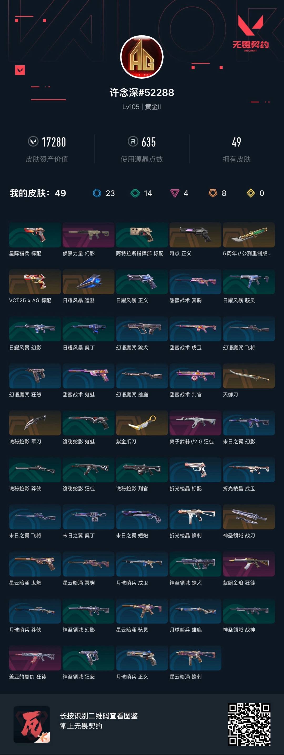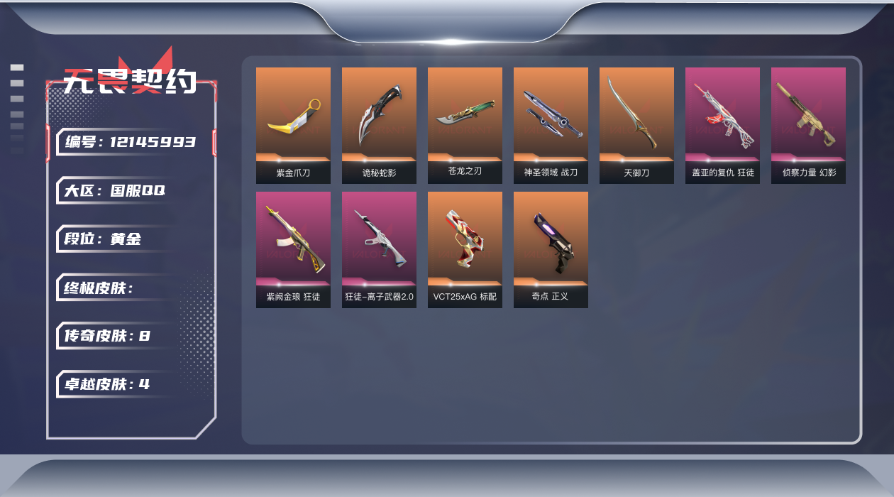 [12145993]8橙皮 4紫皮 49皮肤 18英雄 71卡面 635已用源晶 黄金 优质装备:正义-奇点,狂徒-紫阙金琅,狂徒-盖亚的复仇,幻影-侦察力量,紫金爪刀,天御刀,神圣领域 战刀,诡秘蛇影,苍龙之刃 佩枪皮肤:标配-VCT25xAG 步枪皮肤:狂徒-离子武器2.0