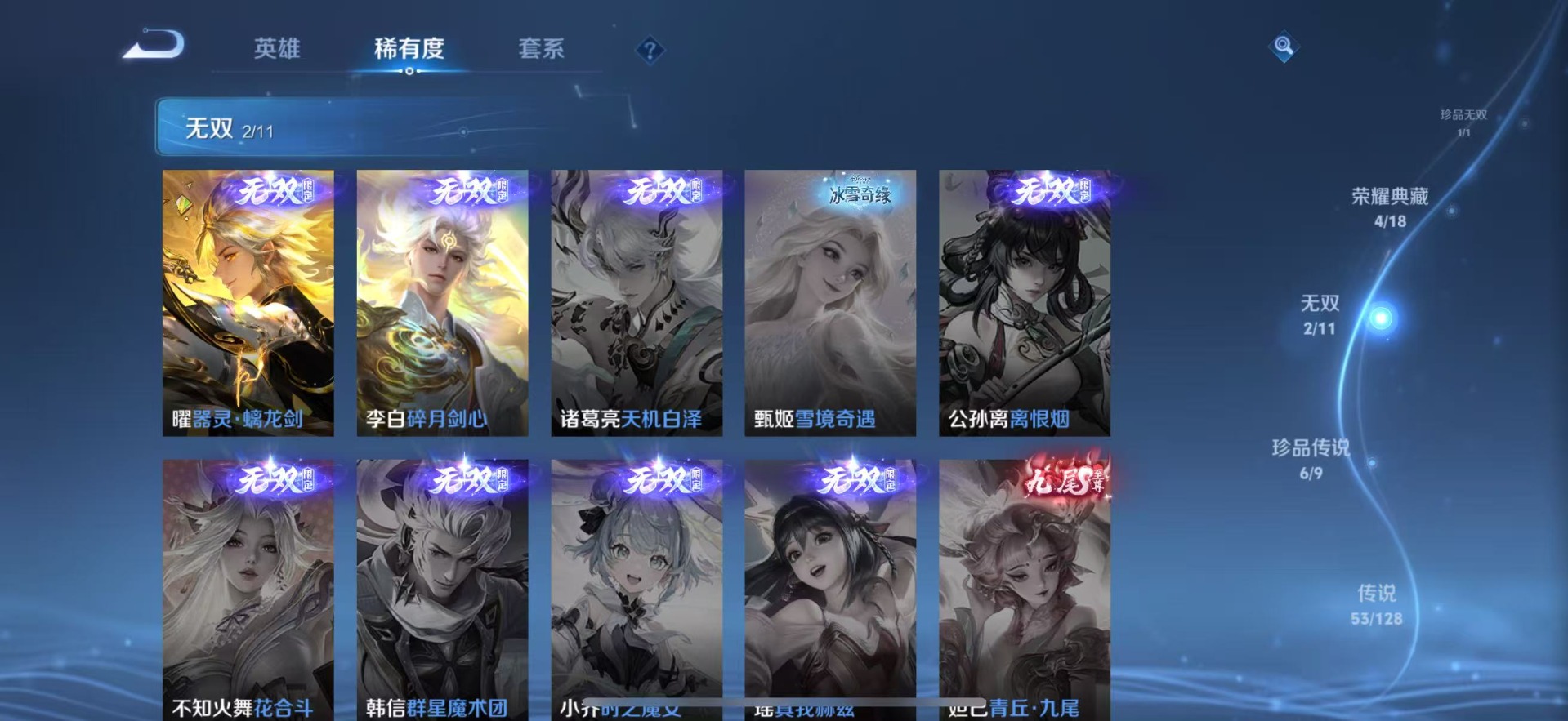 夏侯惇朔风刀,老夫子醍醐杖,盾山御銮,曹操烛龙,孙膑妖精王,典韦穷奇,典韦蓝屏警告,牛魔御旌,项羽苍威无极,鲁班七号狮舞东方,吕布猎兽之王,镜青焰无极,庄周蜃楼王,元歌云间偶戏,裴擒虎擒涛扼浪,鲁班大师探海日志,明世隐疑决卦,白起狰,鬼谷子原初探秘者,张良古海寻踪,女娲朔望之晖,狄仁杰万华元夜,嬴政白昼王子,芈月重明,程咬金演武夺筹,扁鹊炼金王,弈星混沌棋,虞姬凯尔特女王,米莱狄御霄,钟馗神迹守卫,钟馗驱傩正仪,狂铁御狮,太乙真人饕餮