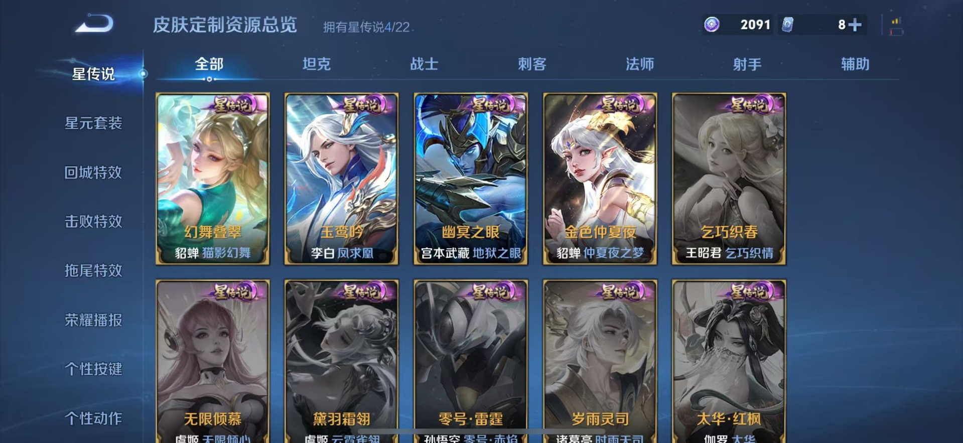 铠绛天战甲,赵云乘龙·铭钟鼎,干将莫邪久胜战神,典韦战鼓燎原,小乔音你心动,李信一念神魔,达摩黄金狮子座,王昭君乞巧织情,露娜霜月吟,镜炽阳神光,杨玉环星之鸣奏,亚连落雪白狼,宫本武藏惊梅引,貂蝉猫影幻舞,裴擒虎祥瑞亨通,夏洛特浮生妄,艾琳觅芳踪,西施游龙清影,西施续相思,张良黄金白羊座,孙悟空零号·赤焰,马超无双飞将,李元芳飞鸢探春,墨子黄金天蝎座,澜逐花归海,貂蝉曦玄引,云缨幻光神枪