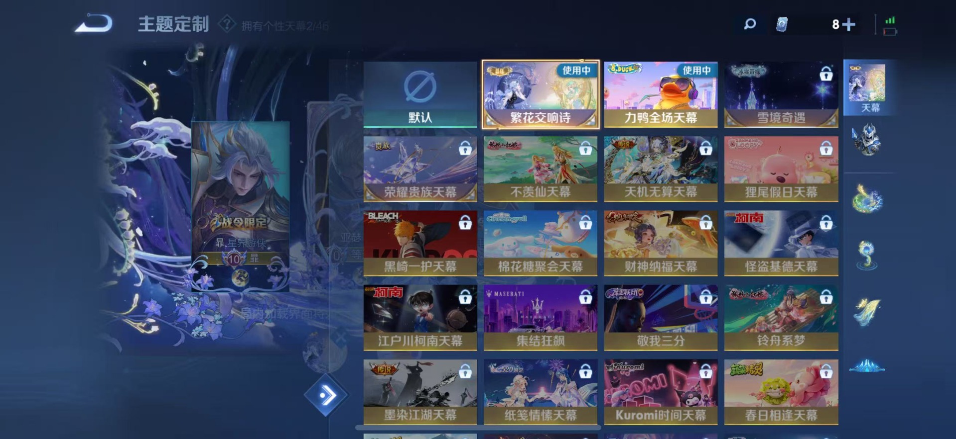 大乔白蛇,高渐离燃音魔法,海诺心动手记,刘邦德古拉伯爵,夏侯惇乘风破浪,阿轲暗夜猫娘,阿轲节奏热浪,哪吒雪上飞焰,铠曙光守护者,曹操幽灵船长,廉颇地狱岩魂,伽罗琥珀纪元,小乔缤纷独角兽,孙尚香时之恋人,阿古朵顽趣,孙策猫狗日记,不知火舞魅语,海月浮梦罗烟,赵怀真器灵·浮梦炉,鲁班七号电玩小子,项羽苍穹之光,吕布圣诞狂欢,露娜紫霞仙子,吕布末日机甲,诸葛亮黄金分割率,司马懿暗渊魔法,刘禅天才门将,刘禅绅士熊喵,宫本武藏鬼剑武藏,公孙离无限星赏官,兰陵王暗隐猎兽者,貂蝉圣诞恋歌,貂蝉唤灵魅影,苍狼魂孤将,花木兰水晶猎龙者,李白千年之狐,安琪拉心灵骇客,艾琳奇遇舞章,杨戬天秀·启明,西施诗语江南,白起星夜王子,白起苍鳞隐世,亚瑟心灵战警,嬴政摇滚巨星,嬴政暗夜贵公子,莱西奥末日机甲,程咬金功夫厨神,雅典娜黎明之约,韩信白龙吟,李元芳逐浪之夏,百里守约特工魅影,墨子龙骑士,墨子金属风暴,蔡文姬舞动绿茵,瑶遇见神鹿,弈星滕王阁序,娜可露露晚萤,王昭君偶像歌手,钟馗乐园奇幻夜,橘右京修罗