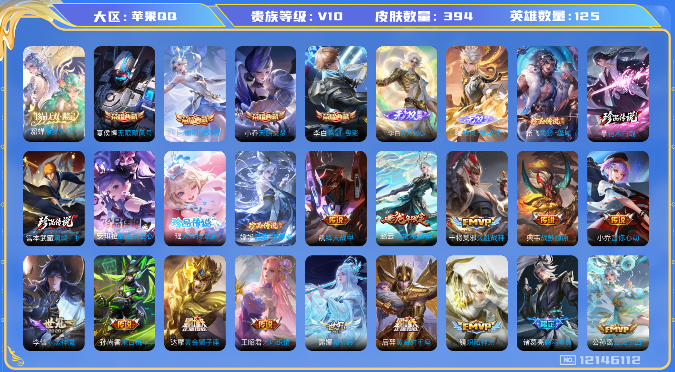 [12146112]V10 4典藏 1珍品无双 2无双 6珍品传说 53传说 125英雄 394皮肤 可修改实名 优质装备:馥梦繁花,天鹅之梦(小乔典藏),无限飓风号(高达),鸣剑·曳影,碎月剑心(李白无双),器灵·螭龙剑,最初的交响(伽罗典藏),器灵·落星盏,酷洛米之心,大耳狗之梦,朽木白哉,黑崎一护,黄金狮子座,黄金射手座,冠军飞将,绛天战甲(鸡嘴战神),黄金白羊座,猫影幻舞,久胜战神,炽阳神光,一念神魔,末日机甲-孙尚香(绿蚂蚱),地狱火,仲夏夜之梦(大飞蛾),音你心动-小乔,零号·赤焰,地狱之眼,飞鸢探春,胖达荣荣,乞巧织情,游龙清影(小青龙),超时空战士-狄仁杰,无双飞将,浮生妄,鹤羽星尊,灼幽烈阳,惊梅引,霜月吟,澜逐花归海,艾琳觅芳踪,黄金天蝎座 珍品传说:兔狲·蓬尾 传说皮:乘龙·铭钟鼎(赵云年限),貂蝉曦玄引,典韦战鼓燎原,落雪白狼,云诺千山,续相思,星之鸣奏,祥瑞亨通,幻光神枪 珍宝阁皮:万物之道,优雅恋人 限定皮:愿照·九州拓(澜年限),愿照·福禄聚(蔡文姬年限),愿照·岁时盈(虞姬年限),愿照·山河定(司空震年限),愿照·众生和(妲己年限),愿照·千秋盛(女娲年限),鸣野蒿,白虎志(电光耗子),凤求凰(白切鸡),凤凰于飞,梅西,傲雪梅枪,魔法小厨娘,时雨天司(水龙头),神威(电光马子),至美·乘鲤谣,至美·化雀舞,遇见飞天,诗剑行,怒海麟威,冰锋战神,梁祝,天狼狩猎者,祈雪灵祝(雪兔子),李小龙,逐梦之影,圣诞老人,引擎之心,冰霜恋舞曲,女儿国国王,神器·万象笔 史诗皮:赞萌露比,鸭鸭历险记-刘禅,苍鳞隐世,器灵·浮梦炉,狼魂孤将,化蝶舞,龙之律动,灵蛊蚀心,琥珀纪元伽罗,雪豹·霜爪,星界战将,藏狐·褐绒,布丁狗之誓,小牛鸭,石田雨龙,百相守梦-周瑜,戍鼓铭心,茶境仙,星界特工,战舞者,芈月浮光幕影,海诺心动手记,蔬乡物语(鲁班七号),遇见神鹿,紫霞仙子,苍穹之光,电玩小子(小书包),白龙吟,黄金分割率,特工魅影,千年之狐,白蛇,浮梦罗烟,末日机甲-莱西奥,高渐离燃音魔法,蒙恬荣光圣徽,魅语,无限星赏官,晚萤,偶像歌手,完美假期,龙骑士(小龙虾),暗夜猫娘,末日机甲-吕布,猫狗日记-孙策,时之恋人-孙尚香,乱世虎臣,节奏热浪,修罗,女仆咖啡,摇滚巨星,水果甜心,绅士熊喵,天才门将,星夜王子,心灵骇客,功夫厨神,德古拉伯爵,暗隐猎兽者,幽灵船长,鬼剑武藏,暗渊