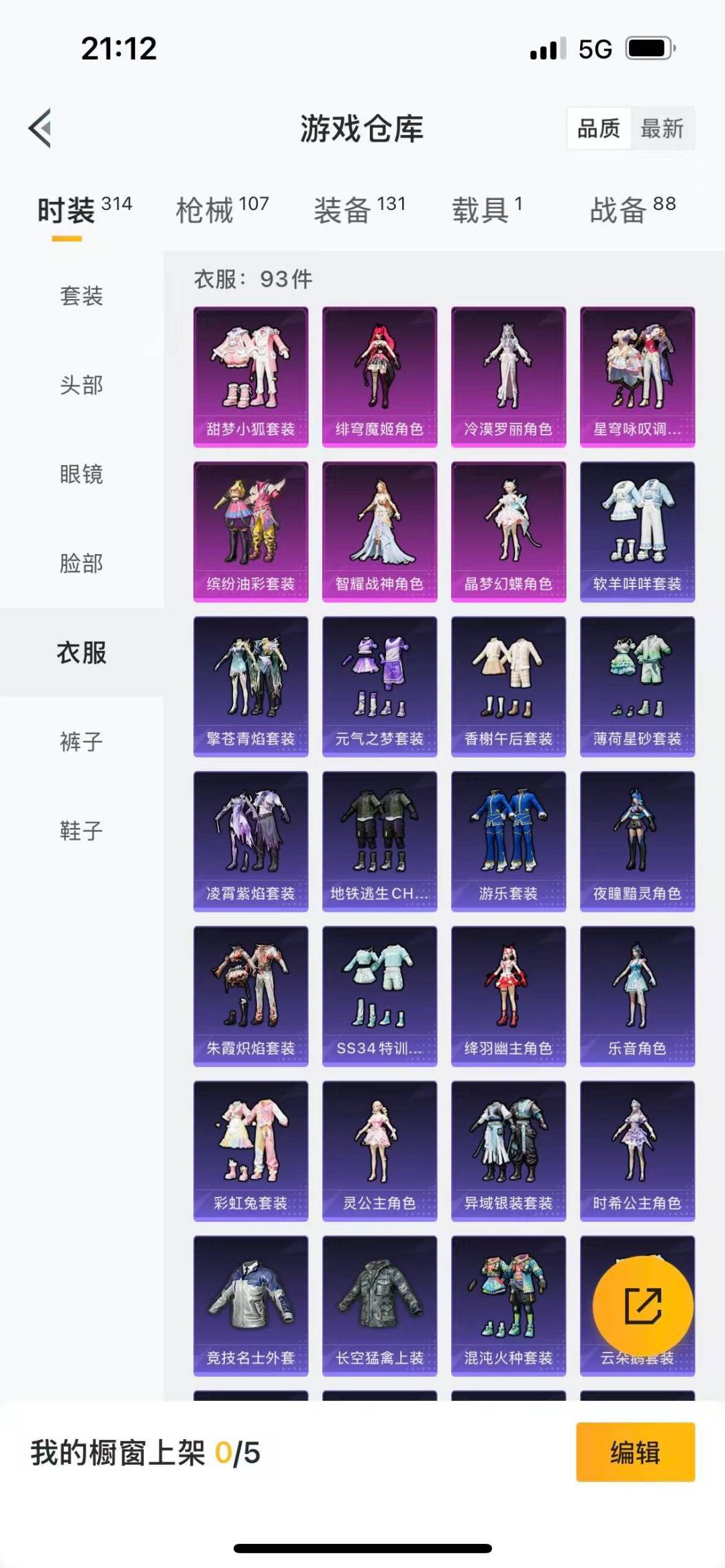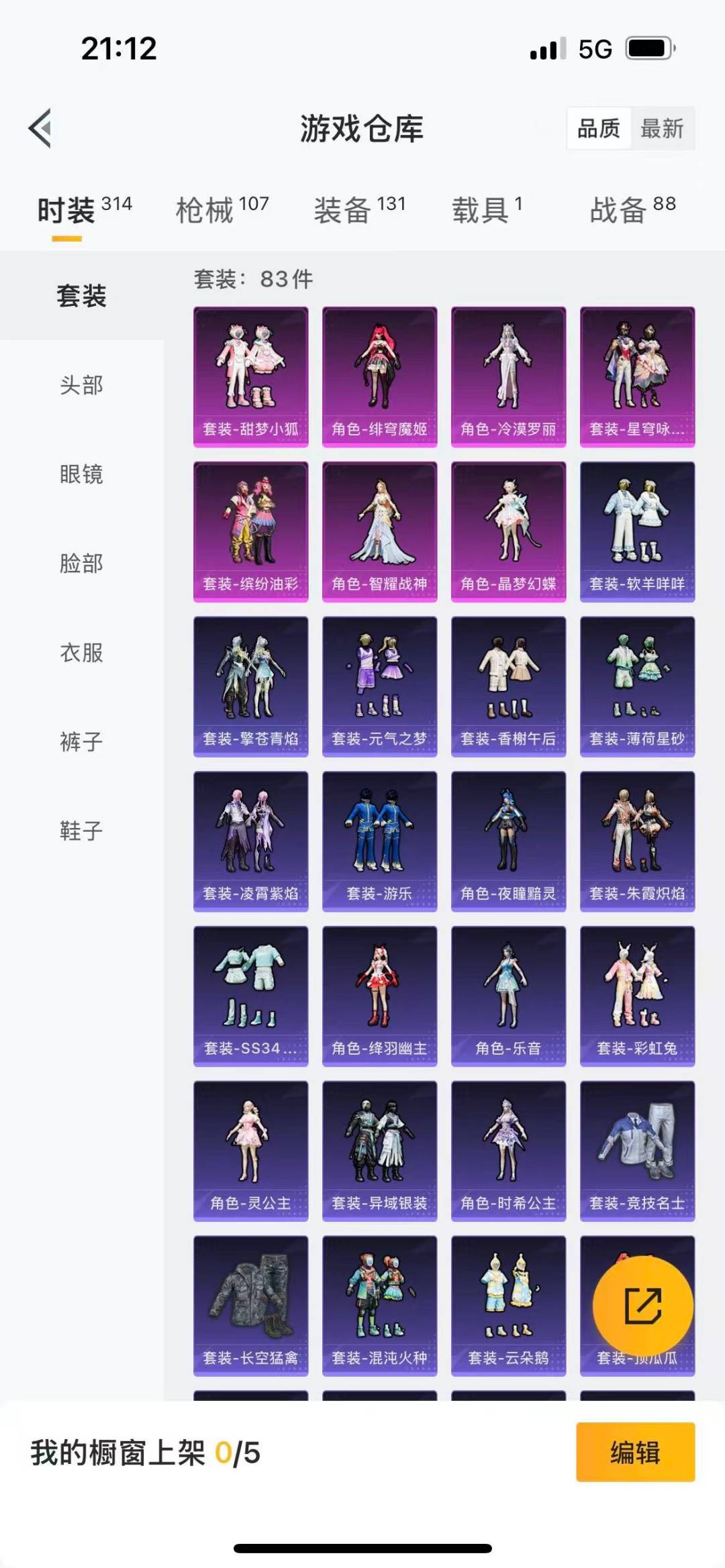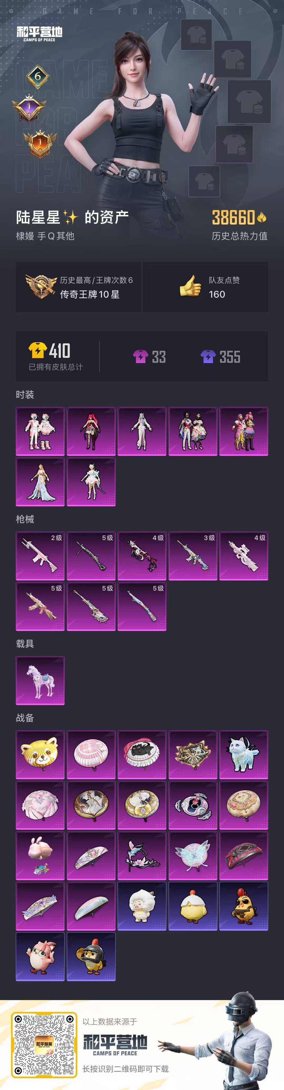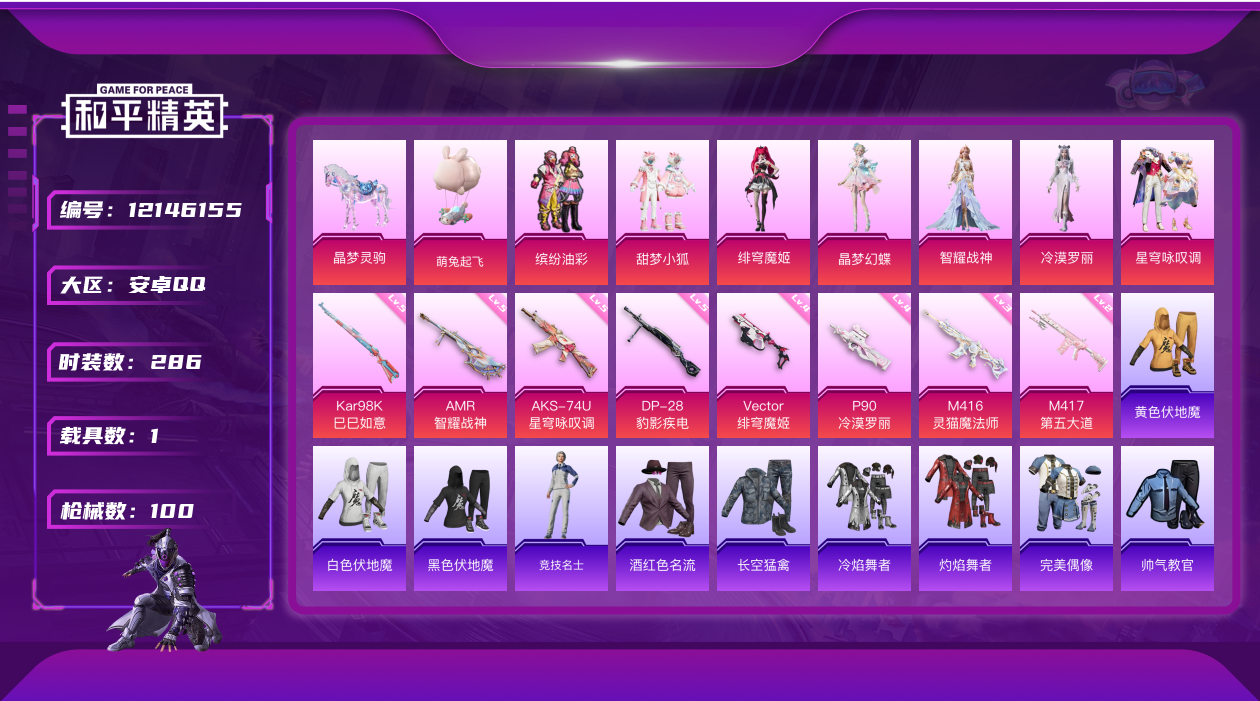 [12146155]7粉装 8特效枪 1载具 6印记 可二次 可修改实名 优质装备:晶梦灵驹,缤纷油彩(猪妹猪脸妹),M417第五大道,晶梦幻蝶,智耀战神,AMR-智耀战神,星穹咏叹调,AKS-74U-星穹咏叹调,冷漠罗丽,P90-冷漠罗丽,M416-灵猫魔法师,绯穹魔姬,Vector-绯穹魔姬,Kar98K-巳巳如意 热门装扮:甜梦小狐 载具:僚机-萌兔起飞 稀有枪皮:DP-28-豹影疾电 五级特效枪:五级Kar98K-巳巳如意,五级DP-28-豹影疾电,五级AMR-智耀战神,五级AKS-74U-星穹咏叹调 四级特效枪:四级P90-冷漠罗丽,四级Vector-绯穹魔姬 三级特效枪:三级M416-灵猫魔法师 二级特效枪:二级M417-第五大道 紫色装扮:莱茵河畔,SS23特训,幻彩翩翩,妙红点点,香榭午后,SS31特训套装,人气偶像,冷焰舞者,极速光影,云朵鹅,彩虹兔,雪绒豹,SS33特训套装,顶瓜瓜,混沌火种,时希公主,灵公主,乐音,软羊咩咩,都市魅力,酒红色名流,酷萌兔限定,长空猛禽,霓虹街区,缤纷果语,绛羽幽主,鹤鸣,黄色伏地魔,黑色伏地魔,龙的传人,龟仙人,极速红龙,柠萌假日,完美偶像,帅气教官,白色伏地魔,破蛋小黄鸡,空岛之星,竞技达人朋克,灼焰舞者,冰公主,异域银装,巳巳如意,竞技名士,SS25特训,锦衣飞扬,SS27特训,明鸳圣池,SS26特训,春光漫游,快闪甜心,贝斯之夜,晶辉守护,大橘大利,星渊小夜曲,星影赞美诗,星谷精灵,耀粉歌者,晶灵使者,粉恋花,蓝冰羽,紫幽梦,SS32特训服(SS32特训套装),青玉碎影,绯格组合,恋语绒绒 优质战备:圣堂之誓降落伞,精灵梦叶罗丽降落伞,莲影清波降落伞,星之彼岸降落伞,时光之誓降落伞,时光之吻降落伞,幻星舰长飞行器,晶梦幻蝶降落伞,冷漠罗丽降落伞,绯穹魔姬降落伞,灵猫魔法师飞行器,灵猫魔法师降落伞,晶梦幻蝶飞行器,暖熊萌萌降落伞,第五大道降落伞