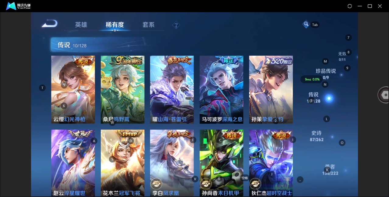 - PX_2096170-53 安卓QQ/至尊星耀/226皮肤/122英雄/1典藏/0珍品无双/1无双/0珍品传说/12传说/51史诗/8稀有英雄 【1 典藏皮肤】活力突击 程咬金, 【1 无双皮肤】群星魔术团 韩信, 【12 传说皮肤】启明星使 虞姬,云霓雀翎 虞姬,逐花归海 澜,曦玄引 吕布,乘龙·问璇玑 孙尚香,时之恋人 刘备,乘龙·淬吴钩 孙策,音你心动 小乔,战鼓燎原 典韦,乘龙·铭钟鼎 赵