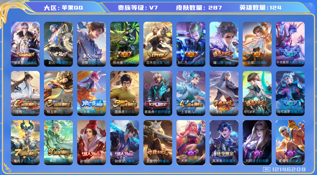 [12146208]V7 1典藏 10传说 124英雄 287皮肤 可修改实名 优质装备:星域神启(倪克斯贼亮),冠军飞将,末日机甲-孙尚香(绿蚂蚱),淬星耀世,超时空战士-狄仁杰,挚爱之约,山海·苍雷引(电光曜子) 传说皮:幻光神枪 珍宝阁皮:蔷薇恋人,女武神 限定皮:鸣野蒿,至尊宝,凤求凰(白切鸡),遇见飞天,高山流水,五谷丰年,梁祝,天狼狩猎者,李小龙,朱雀志(守约年限),大圣娶亲,冰霜恋舞曲,蜜橘之夏,深海之息(深海大菠萝),山海·玄木吟(马可年限) 史诗皮:化蝶舞,灵蛊蚀心,琥珀纪元伽罗,星界战将,百相守梦-黄忠,蔬乡物语(鲁班七号),织梦人,紫霞仙子,电玩小子(小书包),白龙吟,黄金分割率,特工魅影,千年之狐,永昼,冰冠公主,江河有灵,高渐离燃音魔法,蒙恬荣光圣徽,魅语,偶像歌手,龙骑士(小龙虾),暗夜猫娘,末日机甲-吕布,猫狗日记-孙策,猫狗日记-大乔,节奏热浪,修罗,女仆咖啡,摇滚巨星,水果甜心,星夜王子,心灵骇客,功夫厨神,德古拉伯爵,暗隐猎兽者,幽灵船长,鬼剑武藏,心灵战警,舞动绿茵,地狱岩魂,纤云弄巧,繁星吟游(呼啦呼啦),拒霜思,缤纷独角兽,乘风破浪,逐浪之夏,月团寄思,水晶猎龙者,曙光守护者,金属风暴,原初追逐者,圣诞狂欢,圣诞恋歌,鹰眼统帅,暗夜贵公子,黎明之约,赏金猎手,未来纪元-赵云
