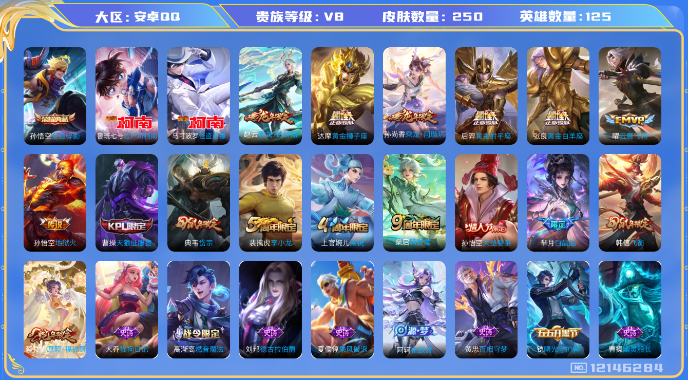 [12146284]V8 1典藏 2珍品传说 10传说 125英雄 250皮肤 可修改实名 优质装备:全息碎影(猴子典藏),江户川柯南,怪盗基德,黄金狮子座,黄金射手座,云鹰飞将(小将军),黄金白羊座,地狱火,涂山容容 传说皮:乘龙·问璇玑(孙尚香年限),乘龙·铭钟鼎(赵云年限) 珍宝阁皮:玩趣恶龙 限定皮:愿照·福禄聚(蔡文姬年限),鸣野蒿,白晶晶,飞衡(韩信年限),梁祝,岱宗(典韦年限),天狼征服者,李小龙,大圣娶亲 史诗皮:化蝶舞,龙之律动,琥珀纪元伽罗,石田雨龙,百相守梦-周瑜,百相守梦-黄忠,谪仙醉月,蔬乡物语(鲁班七号),超元猎域,百相守梦-百里守约,紫霞仙子,黄金分割率,特工魅影,千年之狐,永昼,冰冠公主,高渐离燃音魔法,魅语,末日机甲-吕布,猫狗日记-孙策,猫狗日记-大乔,女仆咖啡,水果甜心,心灵骇客,功夫厨神,德古拉伯爵,暗隐猎兽者,幽灵船长,鬼剑武藏,心灵战警,地狱岩魂,纤云弄巧,繁星吟游(呼啦呼啦),缤纷独角兽,乘风破浪,逐浪之夏,水晶猎龙者,曙光守护者,箭羽风息,原初追逐者,圣诞狂欢,圣诞恋歌,鹰眼统帅,暗夜贵公子,魅力维加斯,未来纪元-赵云