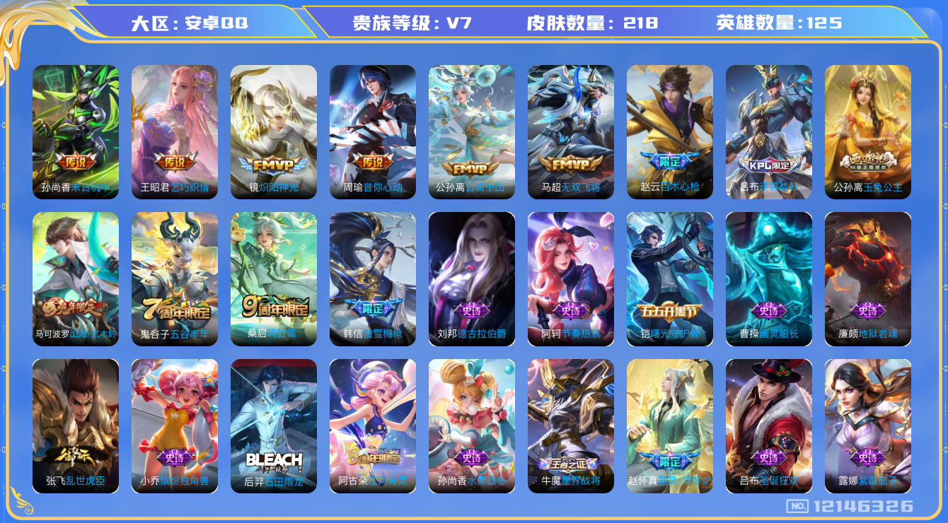 [12146326]V7 7传说 125英雄 218皮肤 可修改实名 优质装备:炽阳神光,末日机甲-孙尚香(绿蚂蚱),音你心动-周瑜,乞巧织情,无双飞将,涂山容容 传说皮:云诺千山 珍宝阁皮:胡桃夹子,女武神 限定皮:逐霄战戟,鸣野蒿,傲雪梅枪,五谷丰年,百木心枪,玉兔公主,山海·玄木吟(马可年限) 史诗皮:器灵·浮梦炉,星界战将,谪仙醉月,龙之律动,石田雨龙,紫霞仙子,黄金分割率,特工魅影,千年之狐,江河有灵,匿光侦查者,百解令(蒙犽),蒙恬荣光圣徽,无限星赏官,冰冠公主,晚萤,乱世虎臣,节奏热浪,女仆咖啡,摇滚巨星,水果甜心,心灵骇客,功夫厨神,德古拉伯爵,暗隐猎兽者,幽灵船长,鬼剑武藏,暗渊魔法,舞动绿茵,地狱岩魂,繁星吟游(呼啦呼啦),拒霜思,缤纷独角兽,逐浪之夏,水晶猎龙者,曙光守护者,唤灵魅影,金属风暴,原初追逐者,圣诞狂欢,圣诞恋歌,鹰眼统帅,暗夜贵公子,魅力维加斯,黎明之约,赏金猎手,无心,玫瑰异探