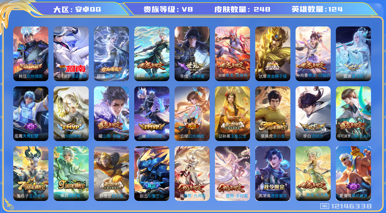 [12146338]V8 1典藏 2珍品传说 15传说 124英雄 248皮肤 可修改实名 优质装备:弑枪猎影(韩信典藏),怪盗基德,器灵·落星盏,黄金狮子座,炽阳神光,一念神魔,天秀幻梦,山海·苍雷引(电光曜子),霜月吟,澜逐花归海,涂山容容 传说皮:乘龙·问璇玑(孙尚香年限),乘龙·铭钟鼎(赵云年限),乘龙·淬吴钩(孙策年限),幻光神枪 珍宝阁皮:玩趣恶龙 限定皮:愿照·九州拓(澜年限),愿照·岁时盈(虞姬年限),鸣野蒿,诗剑行,五谷丰年,李小龙,孙行者,引擎之心,玉兔公主,山海·玄木吟(马可年限) 史诗皮:器灵·浮梦炉,琥珀纪元伽罗,蔬乡物语(鲁班七号),乘龙·聚宝船(安琪拉年限),乘龙·忆丹青(大乔年限),百相守梦-百里守约,紫霞仙子,白龙吟,黄金分割率,特工魅影,千年之狐,江河有灵,真我赫兹(百里守约),魅语,百解令(蒙犽),高渐离燃音魔法,蒙恬荣光圣徽,冰冠公主,偶像歌手,晚萤,电玩·爆裂旋风,百相守梦(刘备),末日机甲-吕布,猫狗日记-孙策,乱世虎臣,节奏热浪,修罗,女仆咖啡,摇滚巨星,水果甜心,绅士熊喵,星夜王子,心灵骇客,功夫厨神,暗隐猎兽者,幽灵船长,鬼剑武藏,天秀·启明,地狱岩魂,纤云弄巧,繁星吟游(呼啦呼啦),拒霜思,缤纷独角兽,乘风破浪,逐浪之夏,水晶猎龙者,曙光守护者,热力回旋,箭羽风息,金属风暴,鹰眼统帅,暗夜贵公子,赏金猎手,天秀幻梦,无心,未来纪元-赵云,玫瑰异探
