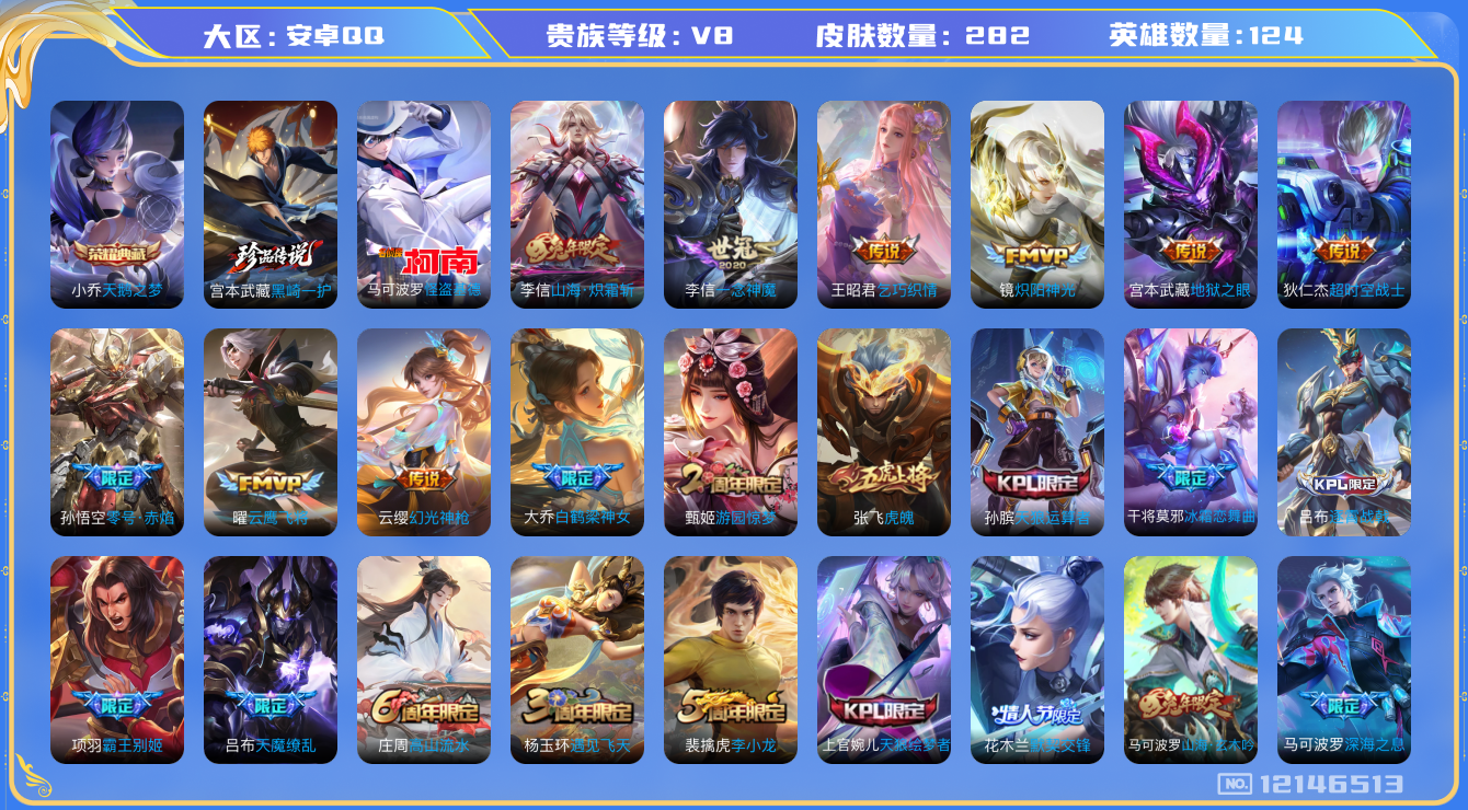 [12146513]V8 1典藏 2珍品传说 14传说 124英雄 282皮肤 可修改实名 优质装备:天鹅之梦(小乔典藏),怪盗基德,黑崎一护,云鹰飞将(小将军),炽阳神光,一念神魔,零号·赤焰,地狱之眼,乞巧织情,超时空战士-狄仁杰,山海·炽霜斩(李信年限),涂山容容 传说皮:幻光神枪 珍宝阁皮:妄想食味,优雅恋人,蔷薇恋人 限定皮:逐霄战戟,鸣野蒿,白鹤梁神女,神威(电光马子),遇见飞天,高山流水,五谷丰年,天狼运算者,游园惊梦,虎魄,天狼绘梦者,李小龙,霸王别姬-项羽,奇迹圣诞,默契交锋-花木兰,天魔缭乱,冰霜恋舞曲,时之祈愿-云中君,时之祈愿-瑶(瑶传限),深海之息(深海大菠萝),山海·玄木吟(马可年限) 史诗皮:赞萌露比,器灵·浮梦炉,化蝶舞,龙之律动,琥珀纪元伽罗,雪豹·霜爪,星界战将,石田雨龙,百相守梦-黄忠,星界特工,守夜人,织梦人,遇见神鹿,紫霞仙子,黄金分割率,特工魅影,千年之狐,冰冠公主,江河有灵,百解令(蒙犽),蒙恬荣光圣徽,电玩·爆裂旋风,末日机甲-吕布,乱世虎臣,节奏热浪,修罗,女仆咖啡,摇滚巨星,水果甜心,绅士熊喵,星夜王子,心灵骇客,功夫厨神,德古拉伯爵,暗隐猎兽者,幽灵船长,鬼剑武藏,心灵战警,舞动绿茵,地狱岩魂,纤云弄巧,拒霜思,缤纷独角兽,乘风破浪,逐浪之夏,月团寄思,水晶猎龙者,曙光守护者,箭羽风息,金属风暴,原初追逐者,圣诞狂欢,圣诞恋歌,鹰眼统帅,魅力维加斯,黎明之约,赏金猎手,无心,未来纪元-赵云