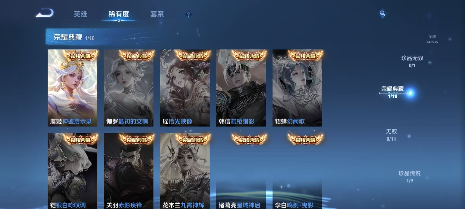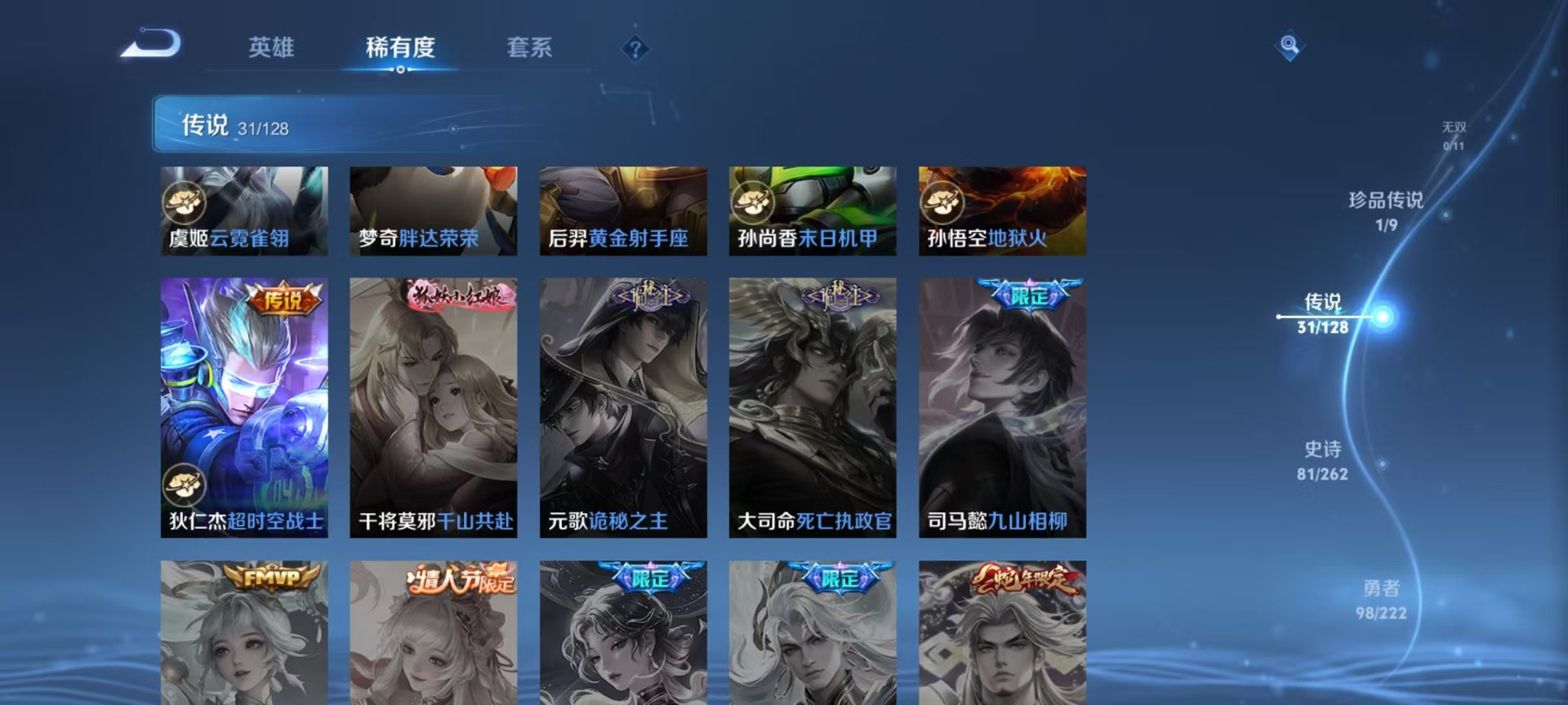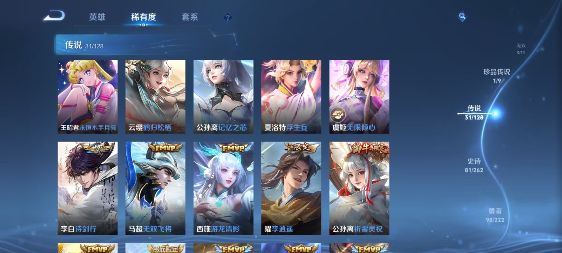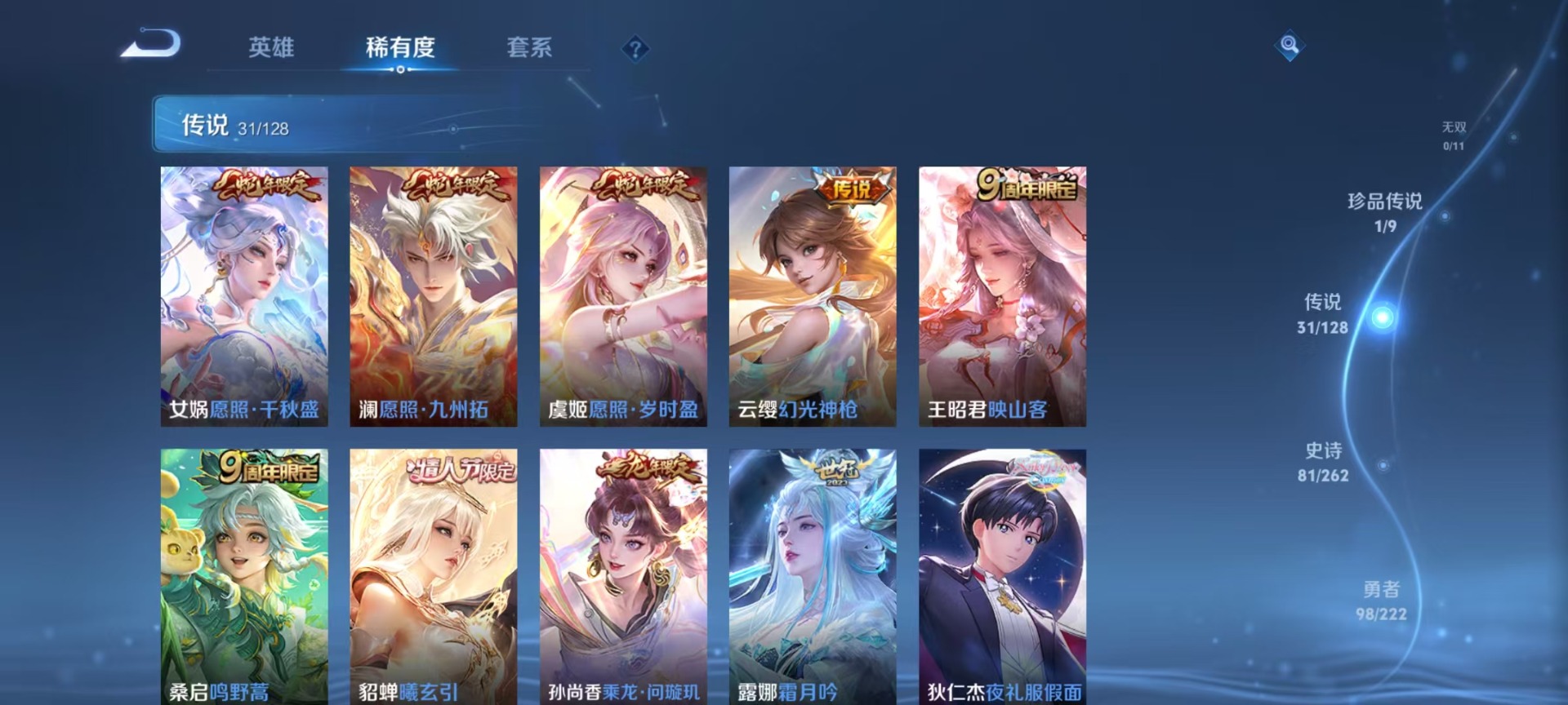 - [12265773]V7 1典藏 1珍品传说 3传说 109英雄 99皮肤 可修改实名 优质装备:赤影疾锋,朽木白哉,涂山容容 传说皮:死亡执政官 限定皮:愿照·山河定(司空震年限),鸣野蒿,至尊宝,至美·乘鲤谣 史诗皮:飞车小橘子,器灵·浮梦炉,化蝶舞,龙之律动,百相守梦-周瑜,茶境仙,百相守梦-黄忠,星界特工,撼地雄心,破空之剑,百相守梦-百里守约,光弋星穹,紫霞仙子,千年之狐,冰冠公主,偶像歌手,龙骑士(小龙虾),暗夜猫娘,节奏热浪,摇滚巨星,绅士熊喵,星夜王子,功夫厨神,德古拉伯爵,幽灵船长,鬼剑武藏,暗渊魔法,地狱岩魂,乘风破浪,逐浪之夏,曙光守护者,鹰眼统帅,魅力维加斯,黎明之约,雪上飞焰