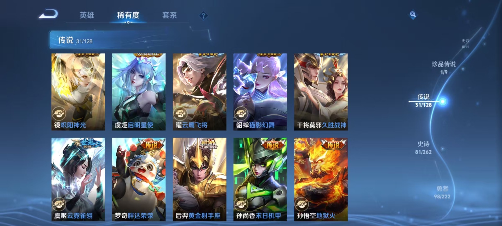 - PX_2090165-实名: 可修改 贵族等级: V7 英雄数: 121 皮肤数: 166 星传说: 金色仲夏夜 传说皮: 炽阳神光,末日机甲-孙尚香,仲夏夜之梦,游龙清影,山海·琳琅生,记忆之芯 限定皮: 李小龙,祈雪灵祝,梁祝,时雨天司,魔法小厨娘,时之彼端,奇迹圣诞,天狼运算者,天狼绘梦者,凤凰于飞,一生所爱,霸王别姬-虞姬,时之祈愿-瑶,五谷丰年,山海·碧波行,至美·乘鲤谣