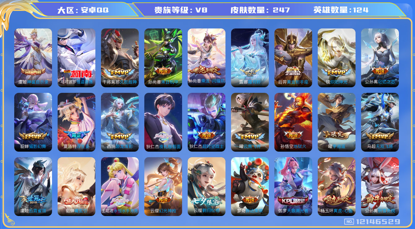 [12146529]V8 1典藏 1珍品传说 31传说 124英雄 247皮肤 可修改实名 女号 优质装备:神鉴启示录,怪盗基德,黄金射手座,云鹰飞将(小将军),猫影幻舞,久胜战神,炽阳神光,云霓雀翎,末日机甲-孙尚香(绿蚂蚱),地狱火,胖达荣荣,李逍遥,游龙清影(小青龙),超时空战士-狄仁杰,无双飞将,浮生妄,记忆之芯(机甲兔),鹤归松栖(云缨),永恒水手月亮,夜礼服假面,霜月吟,涂山容容 传说皮:乘龙·问璇玑(孙尚香年限),貂蝉曦玄引,幻光神枪 珍宝阁皮:万物之道,玩趣恶龙 限定皮:愿照·九州拓(澜年限),愿照·岁时盈(虞姬年限),愿照·千秋盛(女娲年限),映山客,陌上桑,鸣野蒿,神威(电光马子),至美·乘鲤谣,遇见飞天,诗剑行,无限倾心-虞姬,五谷丰年,天狼溯光者,祈雪灵祝(雪兔子),如梦令-嫦娥,默契交锋-花木兰,孙行者,寅虎·心曲(虎婆),山海·玄木吟(马可年限) 史诗皮:器灵·浮梦炉,瑰影绮梦,化蝶舞,龙之律动,琥珀纪元伽罗,星界战将,百相守梦-周瑜,乘龙·忆丹青(大乔年限),芈月浮光幕影,乘龙·聚宝船(安琪拉年限),遇见神鹿,紫霞仙子,特工魅影,永昼,冰冠公主,鹤归松栖(赵怀真),江河有灵,百解令(蒙犽),蒙恬荣光圣徽,魅语,电玩·爆裂旋风,无限星赏官,晚萤,偶像歌手,匿光破解者,龙骑士(小龙虾),暗夜猫娘,猫狗日记-孙策,时之恋人-孙尚香,修罗,女仆咖啡,水果甜心,星夜王子,心灵骇客,功夫厨神,德古拉伯爵,暗隐猎兽者,幽灵船长,鬼剑武藏,天秀·启明,舞动绿茵,诗语江南,拒霜思,缤纷独角兽,乘风破浪,逐浪之夏,月团寄思,水晶猎龙者,热力回旋,箭羽风息,金属风暴,原初追逐者,圣诞狂欢,圣诞恋歌,鹰眼统帅,暗夜贵公子,黎明之约,滕王阁序,无心,玫瑰异探
