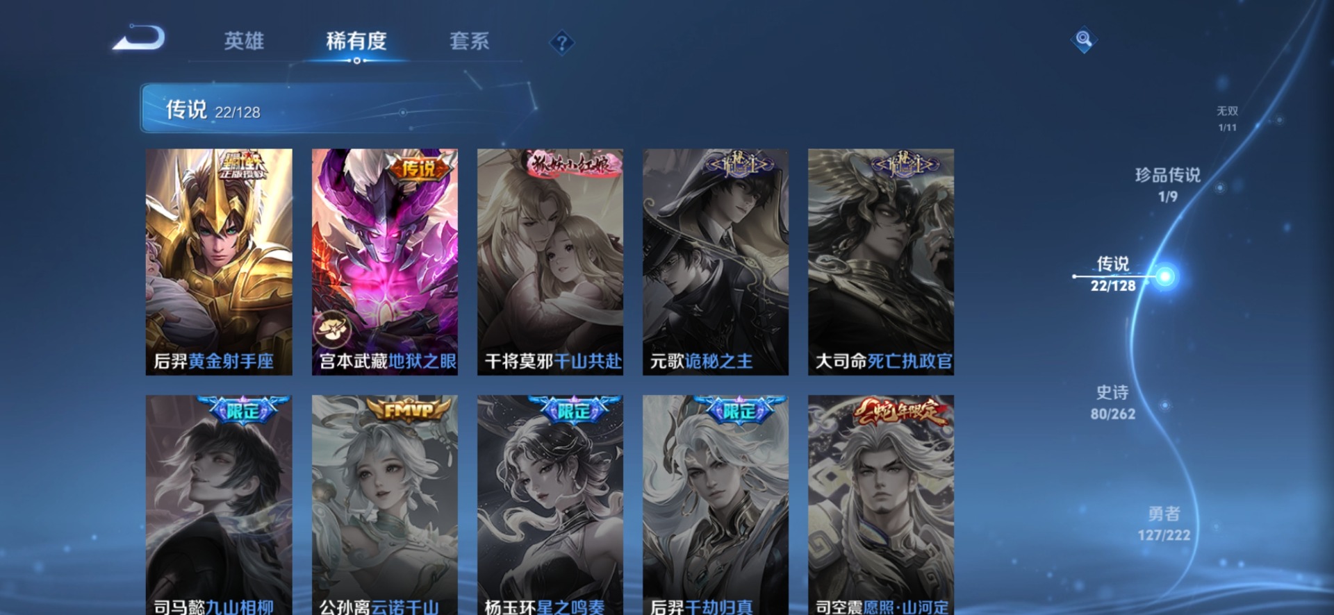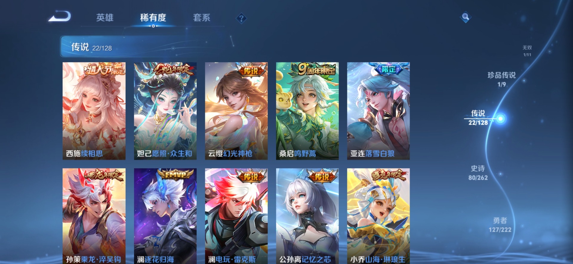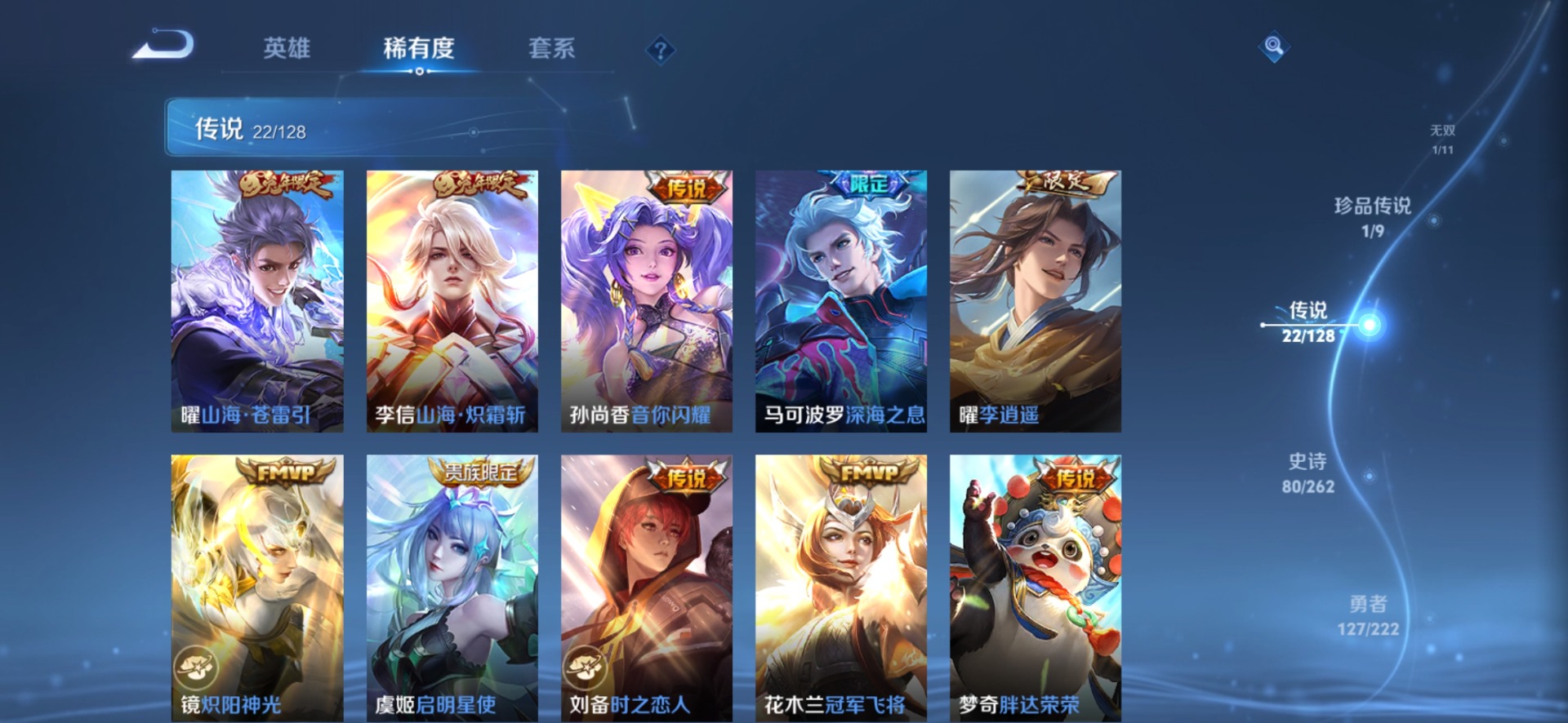 - PX_2093656-贵族5/皮肤126/传说1/史诗29/英雄124/马可波罗怪盗基德/蔷薇恋人/桑启鸣野蒿/姜子牙天穹之誓/狄仁杰阴阳师/赵云皇家上将/蔷薇恋人/元歌无心/万华元夜/沙漠行僧/项羽海滩派对/醍醐杖/演武夺筹/飞衡/王昭君午后时光/金庭之子/云中旅人/驱傩正仪/原初探秘者/鬼谷子五谷丰年/千军破阵/大漠名商/擒涛扼浪/狂铁电玩高手/拒霜思/探海日志/海盐诗旅/阿古朵江河有灵/古海