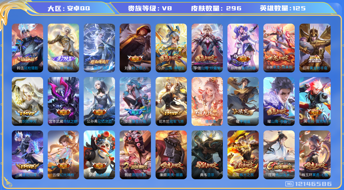 - [11842781]V10 4典藏 1无双 51传说 126英雄 483皮肤 典藏英雄武则天 可修改实名 优质装备:倪克斯神谕(宇宙婆娘),杀手不太冷,鸣剑·曳影,九霄神辉(木兰典藏),青丘·九尾(妲己无双),黄金狮子座,黄金射手座,冠军飞将,云鹰飞将(小将军),绛天战甲(鸡嘴战神),猫影幻舞,久胜战神,炽阳神光,一念神魔,云霓雀翎,末日机甲-孙尚香(绿蚂蚱),地狱火,仲夏夜之梦(大飞蛾),零号·赤焰,海洋之心,地狱之眼,飞鸢探春,胖达荣荣,李逍遥,乞巧织情,时之恋人-刘备(电焊工),游龙清影(小青龙),淬星耀世,超时空战士-狄仁杰,遇见胡旋,天秀幻梦,画中仙,浮生妄,青丘·九尾,百相守梦(张飞),追逃游戏(亚瑟),追逃游戏(安琪拉),灼幽烈阳,艾琳觅芳踪,涂山容容 珍宝阁皮:优雅恋人,玩趣恶龙 限定皮:鸣野蒿,至尊宝,白虎志(电光耗子),凤求凰(白切鸡),凤凰于飞,太华(伽罗年限),梅西,异界灵契(白毛香),傲雪梅枪,补天,寅虎·展翼(孙膑年限),前尘镜,时之彼端,白鹤梁神女,魔法小厨娘,白晶晶,时雨天司(水龙头),神威(电光马子),瑞麟志(木兰年限),遇见飞天,高山流水,怒海麟威,五谷丰年,青龙志(铠年限),冰锋战神,武圣,天狼运算者,游园惊梦,梁祝,御风骁将(吕布年限),天狼狩猎者,龙胆,逐梦之翼,逐梦之星,烈魂,岱宗(典韦年限),天狼溯光者,虎魄,天狼征服者,奔雷神使(牛魔年限),祈雪灵祝(雪兔子),天狼绘梦者,李小龙,逐梦之影,逐梦之光,玄武志(苏烈年限),朱雀志(守约年限),辉光之辰,如梦令-嫦娥,如梦令-后羿,霸王别姬-项羽,霸王别姬-虞姬,默契交锋-兰陵王,默契交锋-花木兰,真爱至上,纯白花嫁,孙行者,猪悟能,一生所爱,大圣娶亲,引擎之心,天魔缭乱,青春决赛季,冰霜恋舞曲,乒乒小将,蜜橘之夏,神奇女侠,美猴王,匿光追影者,女儿国国王,寅虎·御盾(廉颇年限),寅虎·瑞焰(虎皮蛋子),寅虎·心曲(虎婆),寅虎·赤拳(老虎年限),时之祈愿-云中君,时之祈愿-瑶(瑶传限),无尽星芒,深海之息(深海大菠萝),匿光启智者 史诗皮:灵蛊蚀心,星界战将,石田雨龙,芈月浮光幕影,蔬乡物语(鲁班七号),遇见神鹿,紫霞仙子,苍穹之光,电玩小子(小书包),白龙吟,黄金分割率,特工魅影,千年之狐,永昼,江河有灵,匿光侦查者,魅语,蒙恬荣光圣徽,无限星赏官,匿光破解者,冰冠公主,偶像歌手,晚