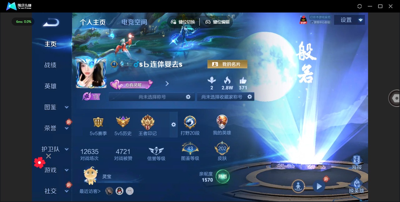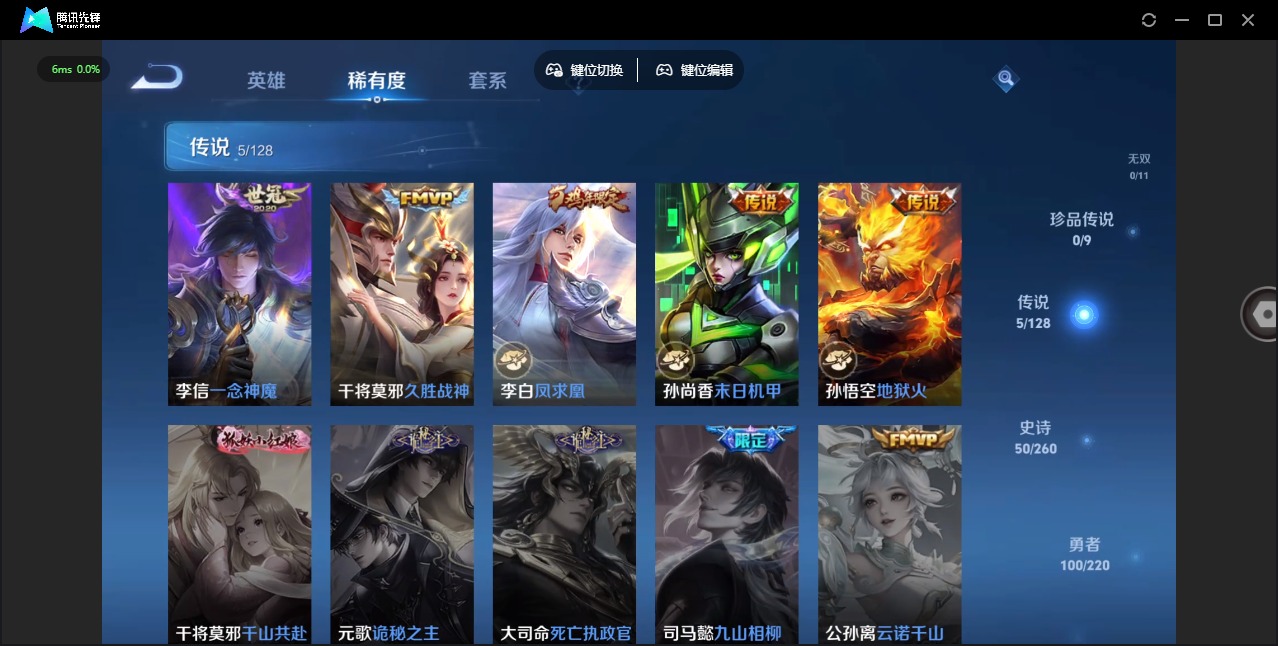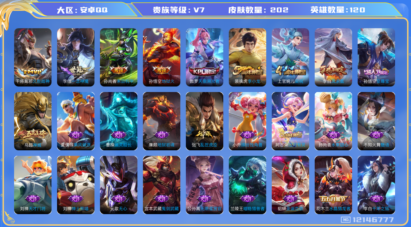 - PX_2093921-实名: 可修改 贵族等级: V5 英雄数: 77 皮肤数: 46 传说皮: 云鹰飞将 限定皮: 逐霄战戟,愿照·山河定