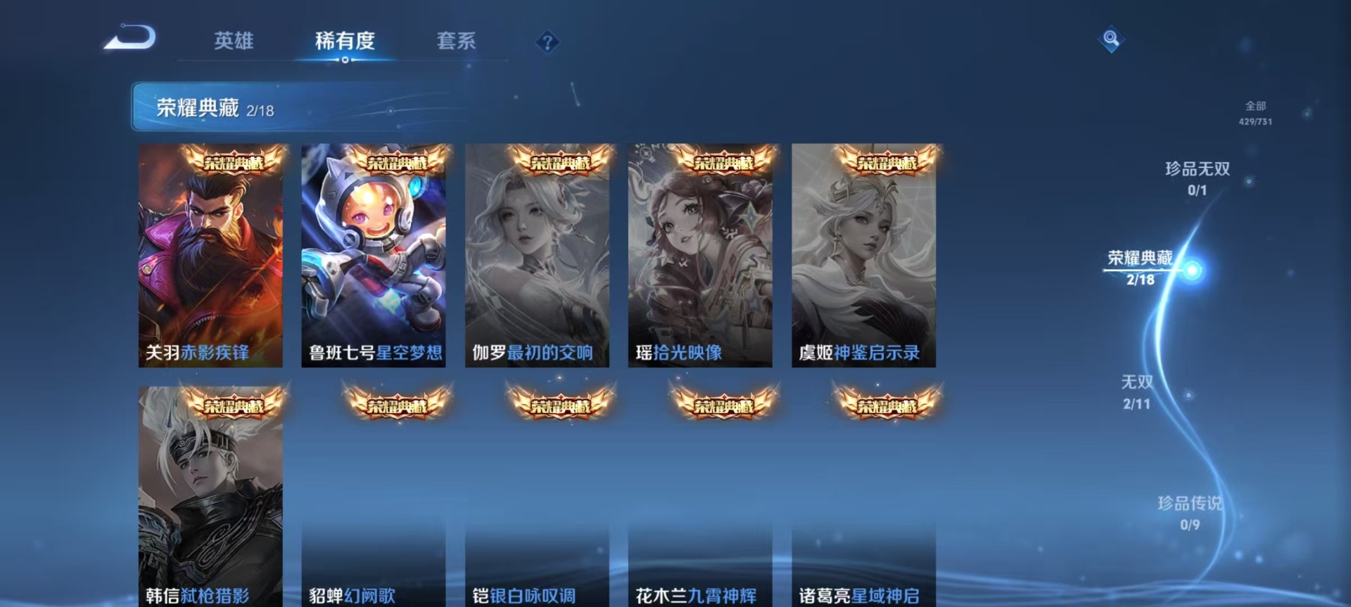 刘邦夺宝奇兵,夏侯惇朔风刀,老夫子醍醐杖,沈梦溪星空之诺,沈梦溪大漠名商,盾山御銮,曹操烛龙,孙膑妖精王,苏烈千军破阵,典韦穷奇,达摩沙漠行僧,牛魔御旌,项羽苍威无极,鲁班七号狮舞东方,镜青焰无极,兰陵王金庭之子,裴擒虎擒涛扼浪,鲁班大师探海日志,明世隐疑决卦,蒙犽狂想玩偶喵,马可波罗暗影游猎,白起狰,鬼谷子原初探秘者,张良古海寻踪,女娲朔望之晖,桑启海盐诗旅,芈月重明,程咬金演武夺筹,扁鹊炼金王,李元芳银河之约,李元芳云中旅人,弈星混沌棋,虞姬凯尔特女王,钟馗驱傩正仪,狂铁御狮,太乙真人饕餮
