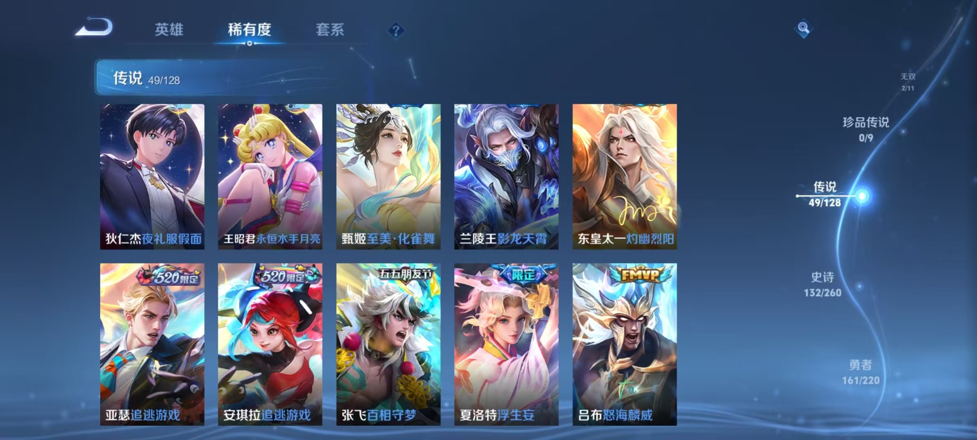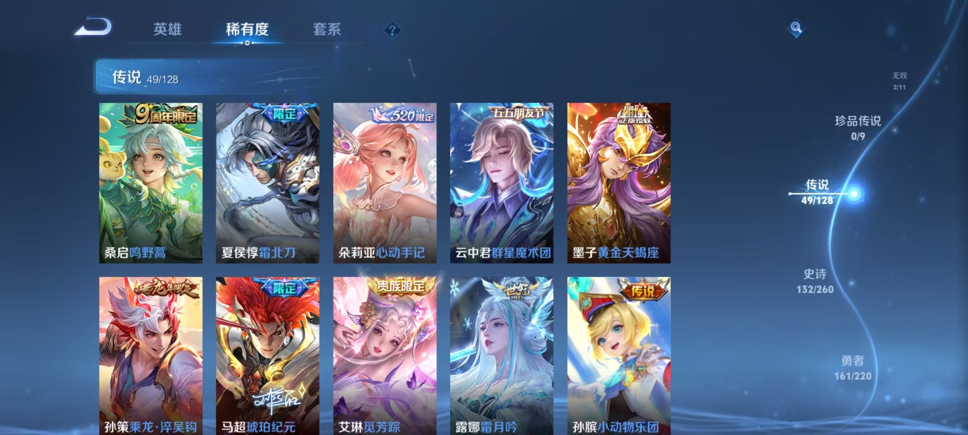 - [12233652]V8 1典藏 10传说 123英雄 257皮肤 可修改实名 女号 优质装备:天鹅之梦(小乔典藏),末日机甲-孙尚香(绿蚂蚱),仲夏夜之梦(大飞蛾),音你心动-小乔,游龙清影(小青龙),山海·琳琅生(小乔年限) 传说皮:乘龙·问璇玑(孙尚香年限),云诺千山 珍宝阁皮:妄想食味,蔷薇恋人 限定皮:愿照·众生和(妲己年限),愿照·千秋盛(女娲年限),时之彼端,魔法小厨娘,山海·碧波行(瑶年限),五谷丰年,岱宗(典韦年限),李小龙,默契交锋-花木兰,一生所爱,寅虎·心曲(虎婆),时之奇旅-妲己,神器·万象笔 史诗皮:鸭鸭历险记-刘禅,化蝶舞,龙之律动,小牛鸭,百相守梦-周瑜,涂山红红,乘龙·聚宝船(安琪拉年限),百相守梦-黄忠,织梦人,遇见神鹿,紫霞仙子,高渐离燃音魔法,冰冠公主,青蛇,偶像歌手,白蛇,晚萤,电玩·爆裂旋风,女仆咖啡,水果甜心,心灵骇客,德古拉伯爵,幽灵船长,鬼剑武藏,地狱岩魂,诗语江南,繁星吟游(呼啦呼啦),缤纷独角兽,乘风破浪,水晶猎龙者,唤灵魅影,金属风暴,圣诞恋歌,鹰眼统帅,魅力维加斯,无心,未来纪元-赵云
