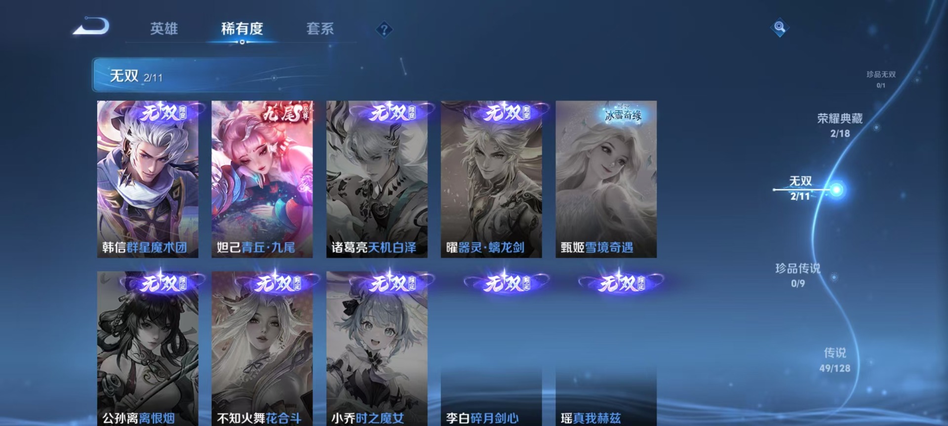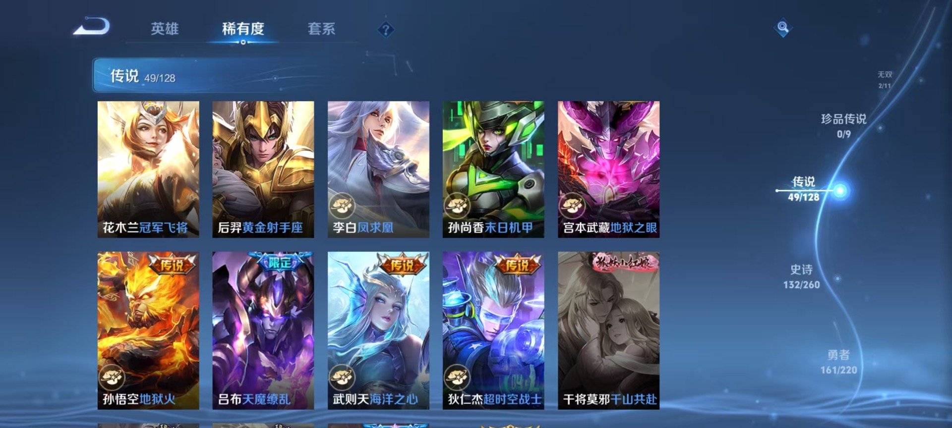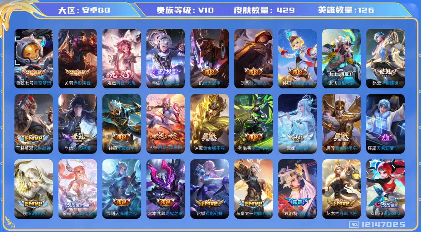 [12147025]V10 2典藏 2无双 49传说 126英雄 429皮肤 典藏英雄武则天 可修改实名 优质装备:星空梦想(太空人),赤影疾锋,青丘·九尾(妲己无双),韩信群星魔术团(韩信无双),黄金狮子座,黄金射手座,冠军飞将,云鹰飞将(小将军),绛天战甲(鸡嘴战神),黄金白羊座,猫影幻舞,久胜战神,炽阳神光,一念神魔,云霓雀翎,末日机甲-孙尚香(绿蚂蚱),地狱火,海洋之心,地狱之眼,飞鸢探春,时之恋人-刘备(电焊工),淬星耀世,超时空战士-狄仁杰,末日机甲-孙策,花朝如约(花篮子),碎云,天秀幻梦,浮生妄,青丘·九尾,百相守梦(张飞),追逃游戏(亚瑟),追逃游戏(安琪拉),灼幽烈阳,永恒水手月亮,夜礼服假面,小动物乐团,霜月吟,艾琳觅芳踪,琥珀纪元马超,黄金天蝎座,云中君群星魔术团,朵莉亚心动手记 传说皮:乘龙·淬吴钩(孙策年限) 珍宝阁皮:优雅恋人 限定皮:鸣野蒿,夏侯惇霜北刀,至尊宝,凤求凰(白切鸡),凤凰于飞,太华(伽罗年限),前尘镜,至美·化雀舞,影龙天霄,高山流水,诗剑行,怒海麟威,五谷丰年,青龙志(铠年限),游园惊梦,梁祝,逐梦之星,烈魂,岱宗(典韦年限),天狼绘梦者,李小龙,逐梦之影,玄武志(苏烈年限),辉光之辰,圣诞老人,纯白花嫁,孙行者,猪悟能,天魔缭乱,女儿国国王,时之祈愿-瑶(瑶传限),唐三藏,梦圆繁星 史诗皮:星界战将,百相守梦-周瑜,怒海争锋,破空之剑,芈月浮光幕影,海诺心动手记,夜落电台,决胜骁骑,上官婉儿群星魔术团,奇遇星旅,蔬乡物语(鲁班七号),乘龙·忆丹青(大乔年限),百相守梦-百里守约,遇见神鹿,紫霞仙子,苍穹之光,电玩小子(小书包),白龙吟,黄金分割率,特工魅影,千年之狐,永昼,江河有灵,匿光侦查者,鹤归松栖(赵怀真),浮梦罗烟,闲日渔趣,魅语,百解令(蒙犽),蒙恬荣光圣徽,匿光破解者,冰冠公主,偶像歌手,白蛇,晚萤,电玩·爆裂旋风,百相守梦(刘备),暗夜猫娘,百相守梦(关羽),银翎春语,龙骑士(小龙虾),末日机甲-吕布,猫狗日记-孙策,猫狗日记-大乔,时之恋人-孙尚香,乱世虎臣,节奏热浪,修罗,女仆咖啡,摇滚巨星,水果甜心,绅士熊喵,天才门将,星夜王子,心灵骇客,功夫厨神,德古拉伯爵,暗隐猎兽者,幽灵船长,鬼剑武藏,暗渊魔法,心灵战警,乐园奇幻夜,天秀·启明,舞动绿茵,地狱岩魂,诗语江南,繁星吟游(呼啦呼啦),缤纷独角兽,乘风破浪,逐浪