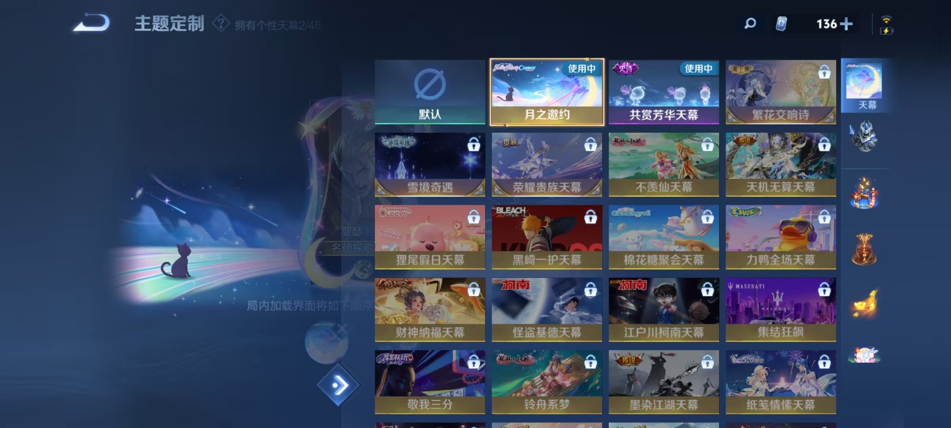 铠绛天战甲,刘备时之恋人,孙膑小动物乐团,张飞百相守梦,赵云淬星耀世,干将莫邪久胜战神,李信一念神魔,孙策末日机甲,孙策乘龙·淬吴钩,达摩黄金狮子座,露娜霜月吟,镜炽阳神光,朵莉亚心动手记,貂蝉猫影幻舞,夏洛特浮生妄,安琪拉追逃游戏,艾琳觅芳踪,亚瑟追逃游戏,狄仁杰夜礼服假面,张良黄金白羊座,曜云鹰飞将,马超琥珀纪元,云中君群星魔术团,百里守约碎云,李元芳飞鸢探春,墨子黄金天蝎座,蔡文姬花朝如约,虞姬云霓雀翎,王昭君永恒水手月亮