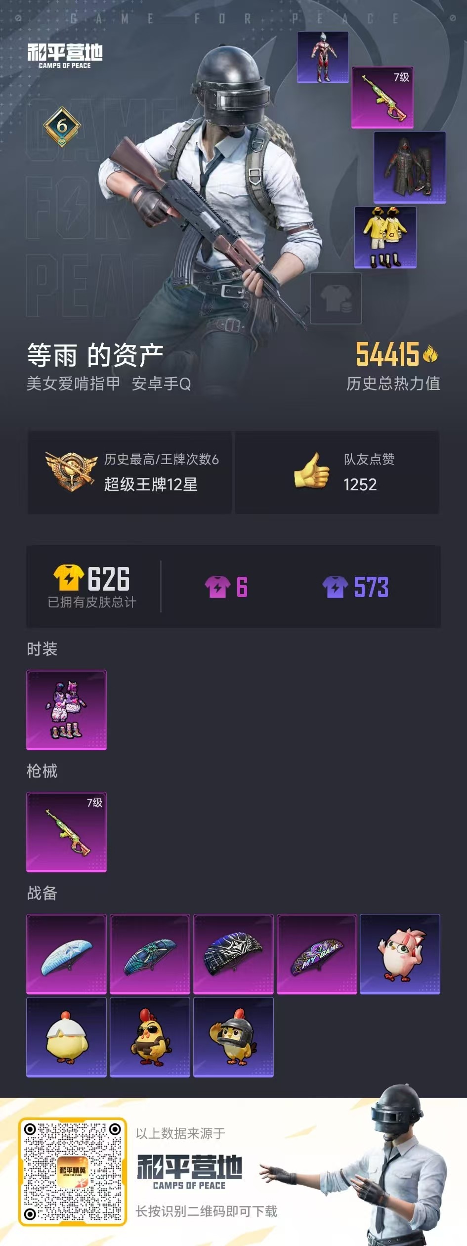 - PX_2088272- 可二次 安卓手Q-12王牌印记-12粉装-5特效枪-0载具-55683热力值-125套装-182枪皮-2卓越印记-0传奇印记, 【12粉装】,梦幻火箭,宝贝奶油派,星穹咏叹调,智耀战神,光极星,闲梦青缨,金属狂野,智能音符,女娲灵识,萨利娅,旋转彩虹,绚金战神, 【5特效枪】,AKM-绿萝繁花-5级,SCAR-L-锦绣绵绵-5级,M416-心之恋语-7级,Kar98K-巳巳