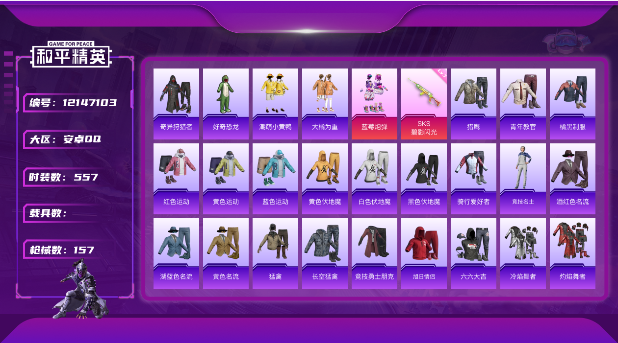 [12147103]1粉装 1特效枪 6印记 可二次 可修改实名 优质装备:奇异狩猎者,SKS-碧影闪光,七级SKS-碧影闪光 热门装扮:蓝莓炮弹,大橘为重,潮萌小黄鸭,好奇恐龙 紫色装扮:旭日情侣,田园牧歌,轻风白浪,SS22特训,北国孤狼,千禧之恋,吉莉礼服,圣诞大吉,坚韧舞者,夏日音浪,夜莺强袭者,幻世战舞者,幻影武者,怒火燎原,刚毅裁决者,冷焰舞者,决胜时刻,人气偶像,六六大吉,冰川特警,SS21特训,时空追击者,暴风机械师,SS16特训,瑞龙福将,团圆交子,SS17特训,捷德奥特曼,治愈之星,科技之星,SS14特训,萌趣颜团子,特种颜团子,快乐星愿,青春冒险家,潮流游乐家,SS15特训,暗夜傀儡,甜心亚梦,虚音幻奏,猎梦纪元,SS20特训,战地督导,娇憨猪猪,萌趣咩咩,异彩先驱,SS18特训,飞驰魅影,音速流光,极速竞梦,SS19特训,英勇保护者,风行保卫者,飞行日记,骑行爱好者,魅力单车,鹤鸣,黄色伏地魔,黄色名流,黄色格斗者,黄色运动,黑色伏地魔,龟仙人,青年教官,都市魅力,酒红色名流,野性战魂,长空猛禽,雪山精英,霓虹极客,霓虹街区,跃动心情,灼焰舞者,深蓝色名流,清新柠檬,湖蓝色名流,滨海假日,滨海厨神,灰色格斗者,炫蓝之夏,热血骑手,牛气冲天,牛气满满,特战英豪,特殊使命,探宝勇士,极地朋克,格斗先锋,橘黑制服,沙漠兵团,特训学院,红色运动,绮丽涂鸦,蓝色运动,虎虎生威吉莉,竞技达人朋克,猎鹰,猛禽,甜蜜告白,甜蜜熊情侣,甜蜜菠萝,疯狂小兔子,白熊同盟,竞技勇士朋克,白色伏地魔,破晓战魂,福星高照,空投萌叽,玉兔迎春,竞技名士,粉红小猪,SS7特训,SS8特训,顽皮玉兔,众神之王,智慧之神,SS9特训,风华少年志,摩艾涂鸦,SS6特训,白月香洋装,原初圣火,逆风勇士,SS12特训,韶华初心,镭射皇者,银白舞王,SS13特训,SS10特训,SS11特训,萌黄之夏,传奇侦探,海上生明月,金耀舞者,蓝调潮人 优质战备:海螺星光降落伞,快乐主宰降落伞,古堡领主降落伞,暗夜玫瑰降落伞