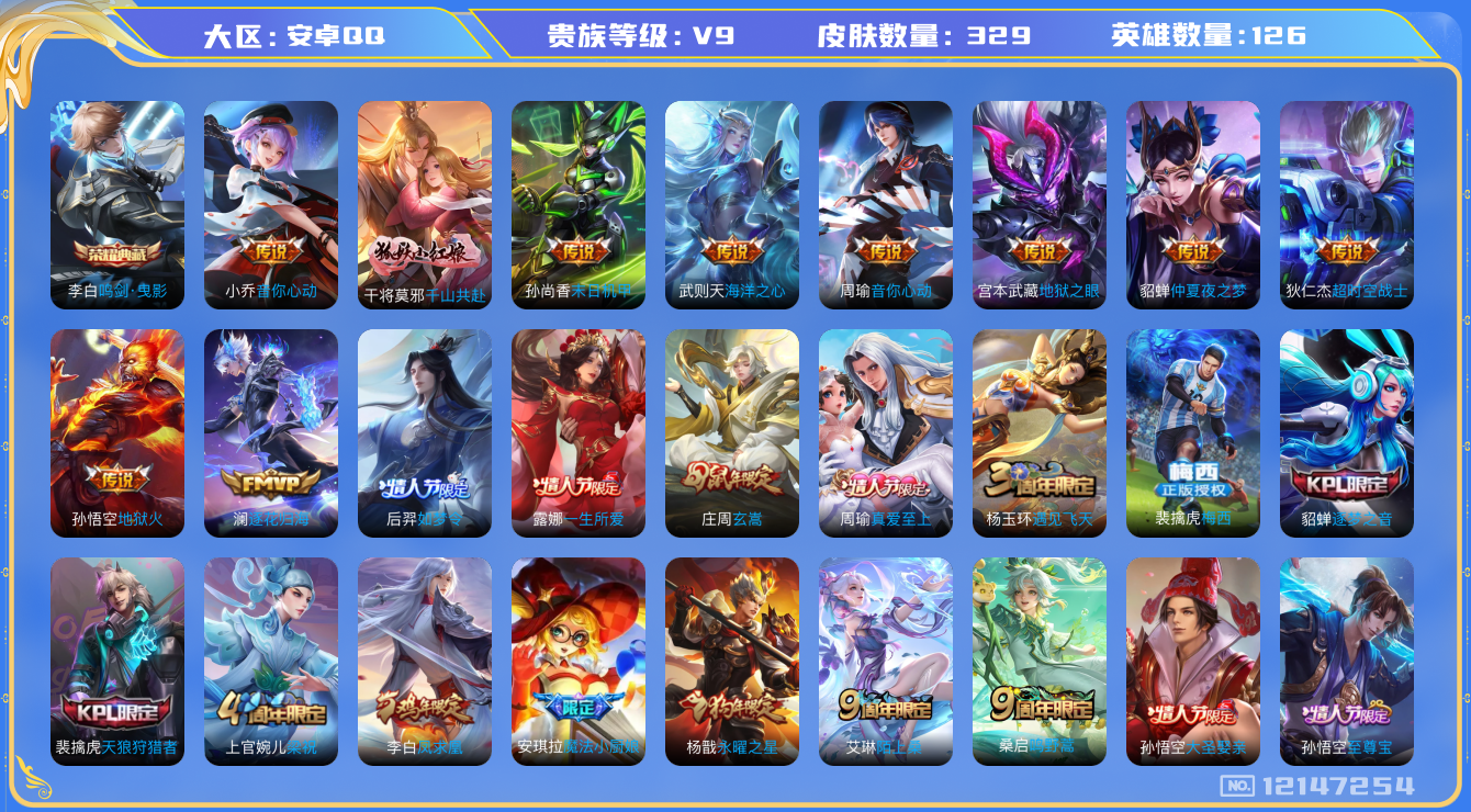 [12147254]V9 1典藏 15传说 126英雄 329皮肤 典藏英雄武则天 可修改实名 优质装备:鸣剑·曳影,末日机甲-孙尚香(绿蚂蚱),地狱火,仲夏夜之梦(大飞蛾),音你心动-小乔,海洋之心,地狱之眼,音你心动-周瑜,超时空战士-狄仁杰,澜逐花归海,千山共赴,涂山容容 珍宝阁皮:优雅恋人 限定皮:陌上桑,鸣野蒿,至尊宝,白虎志(电光耗子),凤求凰(白切鸡),凤凰于飞,梅西,魔法小厨娘,玄嵩(庄周年限),遇见飞天,冰锋战神,梁祝,天狼狩猎者,逐梦之音,逐梦之影,永曜之星,如梦令-后羿,霸王别姬-虞姬,真爱至上,一生所爱,大圣娶亲,引擎之心,热情桑巴,美猴王 史诗皮:灵蛊蚀心,星界战将,龙之律动,石田雨龙,炽弈燎原,破空之剑,东方月初,星界特工,紫霞仙子,苍穹之光,白龙吟,黄金分割率,特工魅影,千年之狐,魅语,冰冠公主,青蛇,偶像歌手,晚萤,末日机甲-吕布,猫狗日记-孙策,猫狗日记-大乔,乱世虎臣,节奏热浪,女仆咖啡,摇滚巨星,水果甜心,天才门将,星夜王子,心灵骇客,功夫厨神,德古拉伯爵,暗隐猎兽者,幽灵船长,鬼剑武藏,心灵战警,舞动绿茵,地狱岩魂,纤云弄巧,繁星吟游(呼啦呼啦),缤纷独角兽,乘风破浪,逐浪之夏,月团寄思,水晶猎龙者,曙光守护者,箭羽风息,金属风暴,原初追逐者,圣诞狂欢,圣诞恋歌,鹰眼统帅,王者之锤,暗夜贵公子,魅力维加斯,无心,未来纪元-赵云