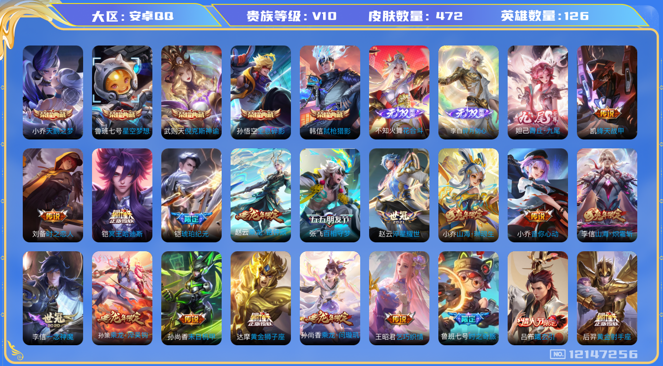 [12147256]V10 5典藏 3无双 53传说 126英雄 472皮肤 典藏英雄武则天 可修改实名 女号 优质装备:天鹅之梦(小乔典藏),星空梦想(太空人),倪克斯神谕(宇宙婆娘),全息碎影(猴子典藏),弑枪猎影(韩信典藏),青丘·九尾(妲己无双),碎月剑心(李白无双),花合斗,黄金狮子座,黄金射手座,冠军飞将,云鹰飞将(小将军),绛天战甲(鸡嘴战神),黄金白羊座,猫影幻舞,炽阳神光,一念神魔,云霓雀翎,末日机甲-孙尚香(绿蚂蚱),地狱火,仲夏夜之梦(大飞蛾),音你心动-小乔,海洋之心,地狱之眼,飞鸢探春,胖达荣荣,乞巧织情,时之恋人-刘备(电焊工),游龙清影(小青龙),淬星耀世,超时空战士-狄仁杰,山海·炽霜斩(李信年限),山海·琳琅生(小乔年限),记忆之芯(机甲兔),青丘·九尾,百相守梦(张飞),电玩·雷克斯,灼幽烈阳,鲁班七号-时之奇旅,澜逐花归海,艾琳觅芳踪,琥珀纪元铠,琥珀纪元马超,黄金天蝎座,涂山容容 传说皮:乘龙·问璇玑(孙尚香年限),乘龙·铭钟鼎(赵云年限),乘龙·淬吴钩(孙策年限),貂蝉曦玄引,吕布曦玄引,落雪白狼,铠冥王哈迪斯,幻光神枪 珍宝阁皮:女武神,玩趣恶龙 限定皮:鸣野蒿,至尊宝,凤求凰(白切鸡),凤凰于飞,太华(伽罗年限),异界灵契(白毛香),前尘镜,时之彼端,白鹤梁神女,魔法小厨娘,白晶晶,飞衡(韩信年限),玄嵩(庄周年限),遇见飞天,齐天大圣,怒海麟威,五谷丰年,青龙志(铠年限),幽恒(沐浴露),天狼运算者,梁祝,逐梦之星,烈魂,岱宗(典韦年限),虎魄,天狼征服者,奔雷神使(牛魔年限),李小龙,辉光之辰,如梦令-嫦娥,如梦令-后羿,霸王别姬-虞姬,默契交锋-花木兰,孙行者,猪悟能,引擎之心,冰霜恋舞曲,无尽星芒,深海之息(深海大菠萝),唐三藏,梦圆繁星 史诗皮:狼魂孤将,化蝶舞,灵蛊蚀心,星界战将,龙之律动,雪豹·霜爪,石田雨龙,怒海争锋,炽弈燎原,涂山红红,埋骨钱,芈月浮光幕影,海诺心动手记,决胜骁骑,蔬乡物语(鲁班七号),曹操夜都魔契,乘龙·聚宝船(安琪拉年限),乘龙·忆丹青(大乔年限),百相守梦-百里守约,百相守梦-黄忠,织梦人,遇见神鹿,紫霞仙子,苍穹之光,电玩小子(小书包),白龙吟,黄金分割率,特工魅影,千年之狐,永昼,真我赫兹(镜),浮梦罗烟,闲日渔趣,魅语,高渐离燃音魔法,蒙恬荣光圣徽,无限星赏官,匿光破解者,冰冠公主