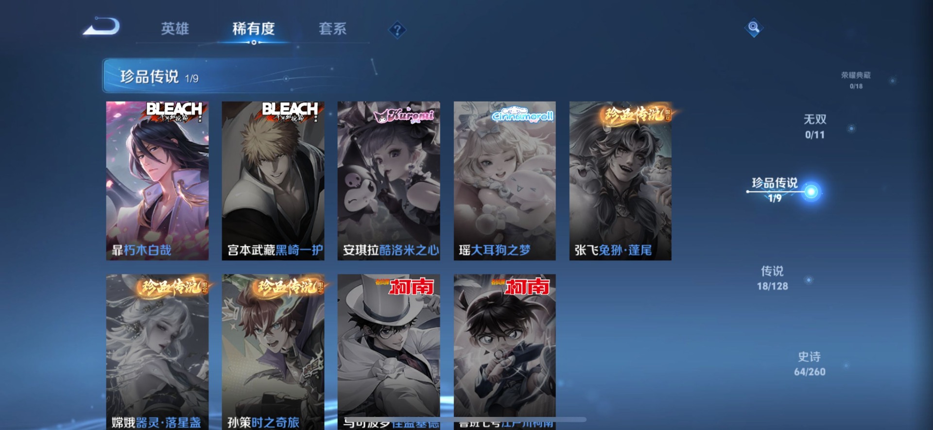 - PX_2106926-【小国标云缨】实名: 可修改 贵族等级: V10 英雄数: 124 皮肤数: 450 荣耀水晶: 武则天,天鹅之梦,星空梦想,倪克斯神谕,活力突击,九霄神辉,赤影疾锋 无双皮: 花合斗,离恨烟 珍品传说: 江户川柯南,怪盗基德,兔狲·蓬尾 星传说: 未来机甲,金色仲夏夜 传说皮: 黄金狮子座,黄金白羊座,猫影幻舞,久胜战神,炽阳神光,末日机甲-孙尚香,仲夏夜之梦,飞鸢探春,胖