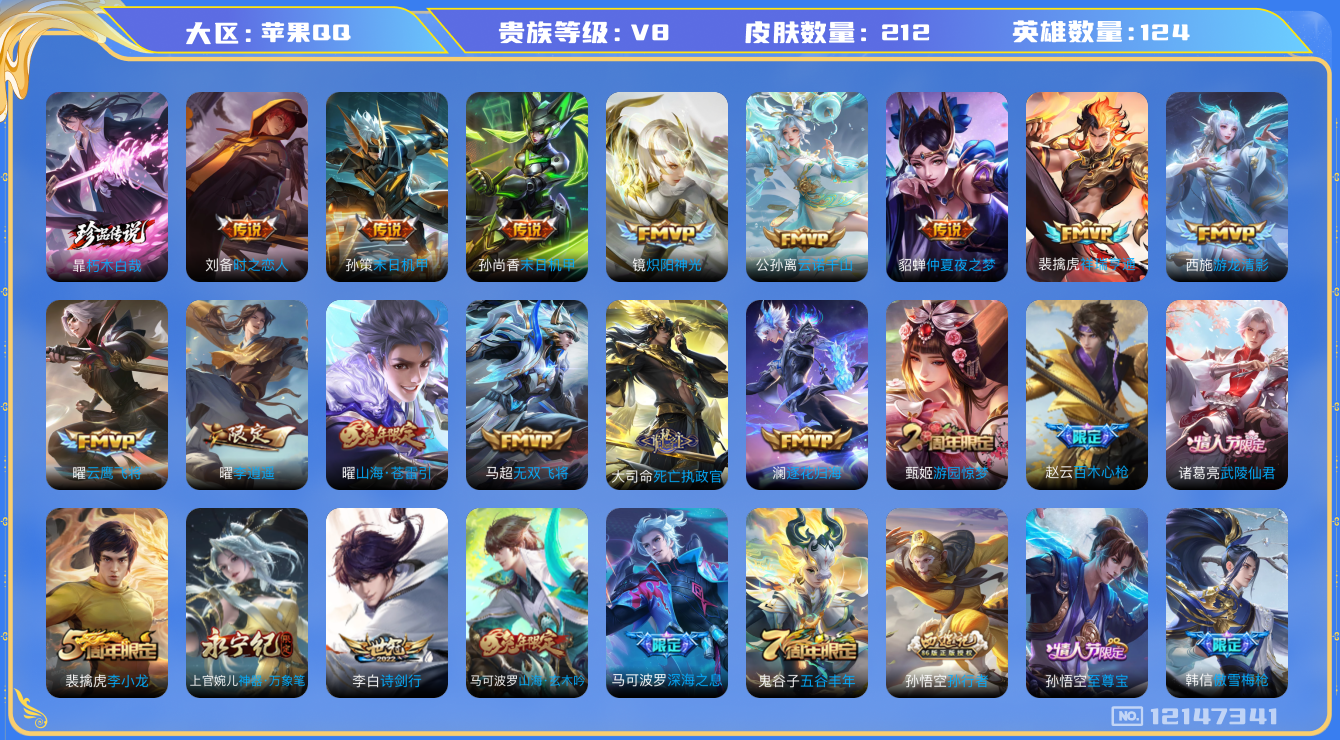 - [11498397]V7 7传说 123英雄 217皮肤 可修改实名 优质装备:云鹰飞将(小将军),炽阳神光,超时空战士-狄仁杰,惊梅引 珍宝阁皮:女武神,玩趣恶龙 限定皮:愿照·九州拓(澜年限),愿照·山河定(司空震年限),鸣野蒿,神威(电光马子),飞衡(韩信年限),高山流水,冰锋战神,梁祝,天狼狩猎者,一生所爱,冰霜恋舞曲,百木心枪,梦圆繁星,山海·玄木吟(马可年限) 史诗皮:破空之剑,百相守梦-百里守约,炽弈燎原,黄金分割率,匿光破解者,江河有灵,蒙恬荣光圣徽,偶像歌手,魅语,无限星赏官,晚萤,冰冠公主,猫狗日记-孙策,猫狗日记-大乔,乱世虎臣,节奏热浪,修罗,女仆咖啡,水果甜心,天才门将,功夫厨神,德古拉伯爵,暗隐猎兽者,幽灵船长,鬼剑武藏,暗渊魔法,心灵战警,天秀·启明,繁星吟游(呼啦呼啦),缤纷独角兽,乘风破浪,逐浪之夏,水晶猎龙者,箭羽风息,金属风暴,原初追逐者,圣诞恋歌,鹰眼统帅,魅力维加斯,黎明之约,无心,未来纪元-赵云